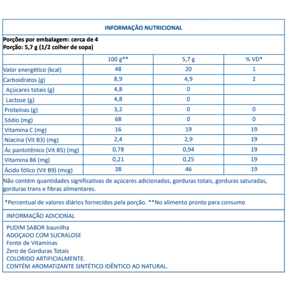 Os pudins Linea são uma deliciosa adição à sua linha de produtos, oferecendo uma variedade de sabores e apresentações para agradar a diferentes paladares. Os pudins Linea se destacam por seu sabor rico e textura cremosa. Cada porção individual é prática e perfeita para quem busca uma experiência indulgente sem abrir mão da saúde. Preparados sem adição de açúcares, são ideais para quem deseja reduzir o consumo de açúcar, sem abrir mão da qualidade. 1 Kit composto por: - 2 Caixas individuais de Pudim Em Pó Linea Sabor Baunilha 25g (cada); - 2 Caixas individuais de Pudim Em Pó Linea Sabor Caramelo 25g (cada); - 2 Caixas individuais de Pudim Em Pó Linea Sabor Chocolate 30g (cada); - 2 Caixas individuais de Pudim Em Pó Linea Sabor Morango 25g (cada). INGREDIENTES DO SABOR BAUNILHA: Amido, mix de vitaminas (C, B3 (niacina), B5, B6 e B9 (ácido fólico), aromatizante, espessante agar, edulcorantes: sucralose e acesulfame de potássio, antiumectante dióxido de silício e corantes: tartrazina e amarelo crepúsculo FCF. NÃO CONTÉM GLÚTEN. INGREDIENTES DO SABOR CARAMELO: Amido, mix de vitaminas (C, B3 (niacina), B5, B6 e B9 (ácidofólico), extrato de chá preto, aromatizante, edulcorantes: sucralose e acesulfame de potássio, antiumectante dióxido de silício e corantes: amarelo crepúsculo FCF e tartrazina. NÃO CONTÉM GLÚTEN. INGREDIENTES DO SABOR CHOCOLATE: Amido, maltodextrina, cacau em pó, mix de vitaminas (C, B3 (niacina), B5, B6 e A), espessante carragena, aromatizante, edulcorantes: sucralose e acesulfame de potássio e antiumectante dióxido de silício. NÃO CONTÉM GLÚTEN. INGREDIENTES DO SABOR MORANGO: Amido, mix de vitaminas (C, B3 (niacina), B5, B6 e B9 (ácido fólico), aromatizante, edulcorantes: sucralose e acesulfame de potássio, antiumectante dióxido de silício e corante carmim. NÃO CONTÉM GLÚTEN, NÃO CONTÉM LACTOSE.