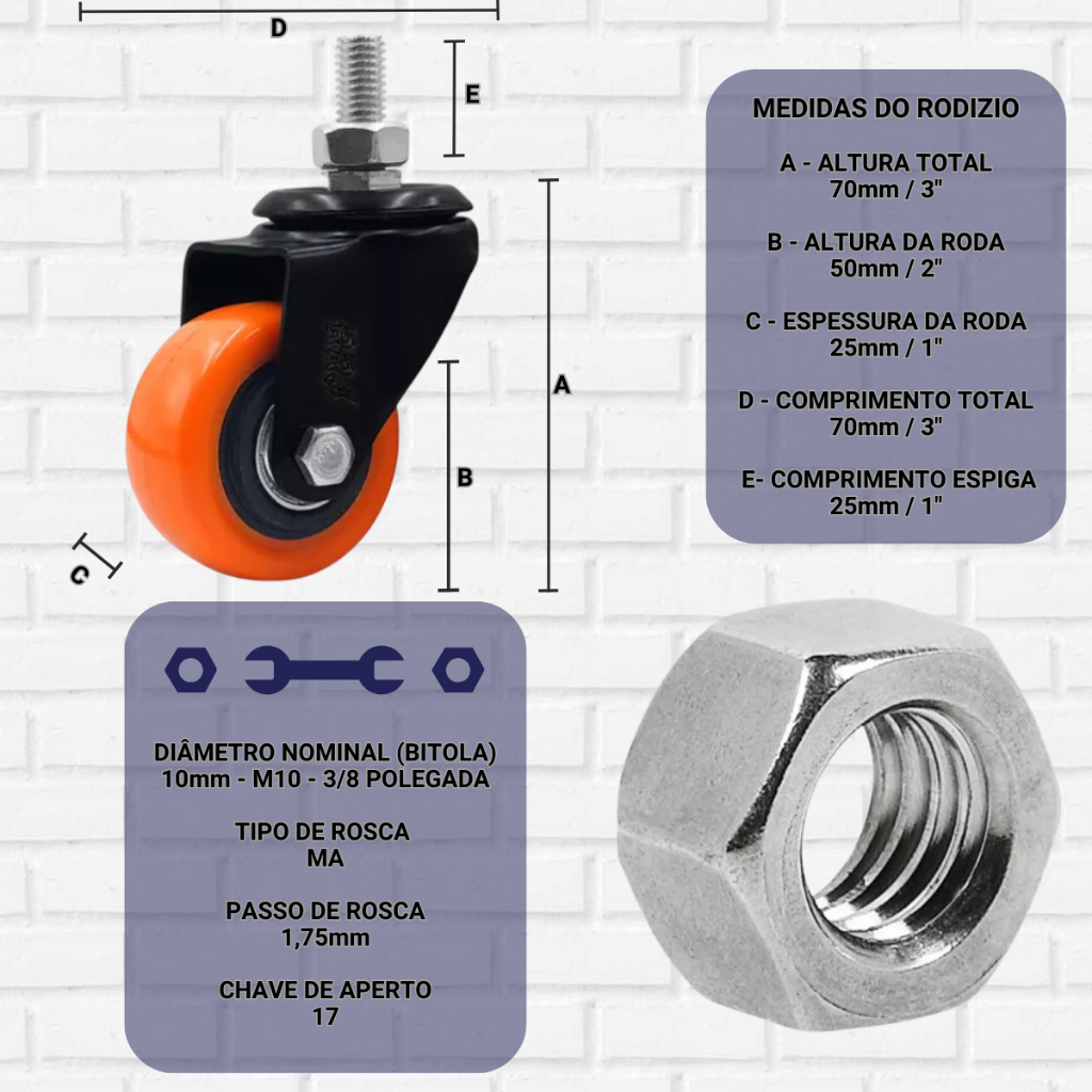 Resiste à corrosão, apresenta boa mobilidade, baixo ruído, maciez, conforto e não marca o piso Ideal para Casas, Empresas, Fábricas, Pisos, Porcelanatos, Cerâmicas e outros diversos. Compatível a Moveis e Decoração, Rack Sala, Mesa de Centro, Caixa de Som, Pallet, Baú, Escrivaninha, Púlpito de Madeira, Mesa de som, Piano de Armário (parede), Sofá Jardim, Caixas para Guardar Equipamentos, Entre outros diversos CARACTERÍSTICAS - Anti - Risco - Reforçado - Rodas Sem Freio - Anti - Ruído - Rolamento de esferas de precisão - Composição: Roda revestida em poliuretano, estrutura em aço. TAMANHO DO RODÍZIO - Altura do rodízio: 7 cm - Altura da roda: 5 cm - Largura da roda: 2 cm - Carga máxima por rodízio: 100 kg - Recomendamos usar 85% da capacidade de peso total para ficar dentro da margem de segurança do fabricante.