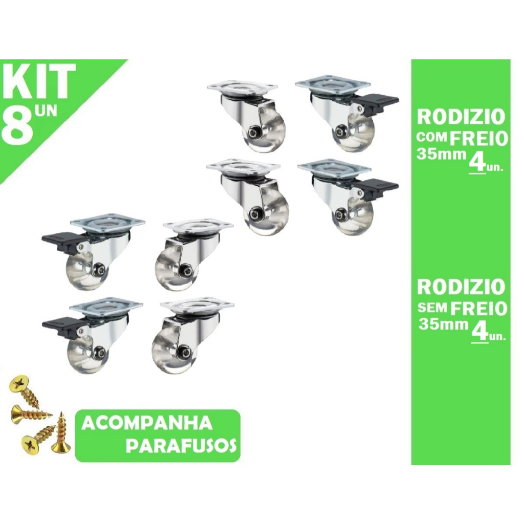 Kit 8 Rodizio Rodinha Giratório 35mm Gel Silicone para Moveis Com e Sem Freio Acompanha Parafuso