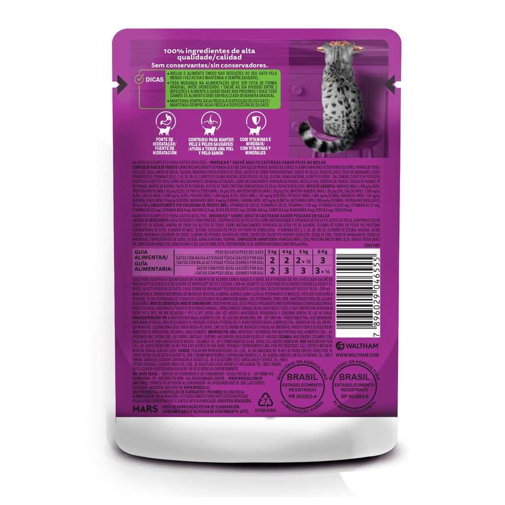 Inclua a Ração Úmida Whiskas Sachê Peixe ao Molho para Gatos Adultos Castrados 85 g nas refeições do seu gato pelo menos 1 vez ao dia e mantenha-o sempre saudável. Toda mudança na alimentação deve ser feita de forma gradual. Inicie oferecendo 1 sachê ao dia dividido entre 2 refeições e aumente a quantidade nos próximos 7 dias. Mantenha sempre água fresca à disposição do seu gato.