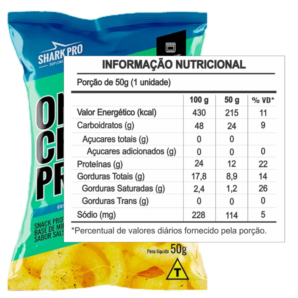 SALGADINHO PROTEICO - 50G Salgadinho funcional com baixo teor de calorias, ideal para atletas que não perdem o foco. Snack com alto teor de proteína, indicado para quem quer manter o metabolismo ativo. Possui 15g de proteína e 10g de aminoácidos, baixo teor de sódio. Recomendação de Consumo: Perfeito para consumir entre as refeições ou como um lanche rápido e nutritivo. Ingredientes: Grits de milho, proteína concentrada do soro de leite, óleo de soja, sal, aroma idêntico ao natural, amido. NÃO CONTÉM GLÚTEN. CONTÉM LACTOSE. ALÉRGICOS: CONTÉM DERIVADOS DE LEITE E SOJA. Características do Produto: - Snack proteico assado à base de milho e whey protein. - Contém proteína. - Opção sem glúten, ideal para pessoas com restrições alimentares ou que buscam uma alimentação mais equilibrada. Aviso legal: • Consumir junto com alimentos para facilitar sua assimilação. • Este produto é um suplemento dietético, não um medicamento. Suplementa dietas insuficientes. Consulte o seu médico e/ou farmacêutico.