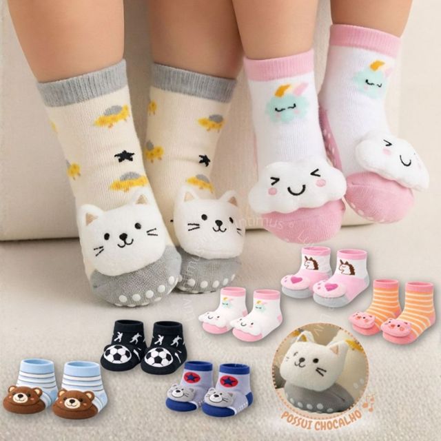 Kit 9, 6 ou 3 Pares de Meias para Bebê Menino ou Menina com Chocalho e Pelúcia Antiderrapante Macia e Confortável 0-24 M