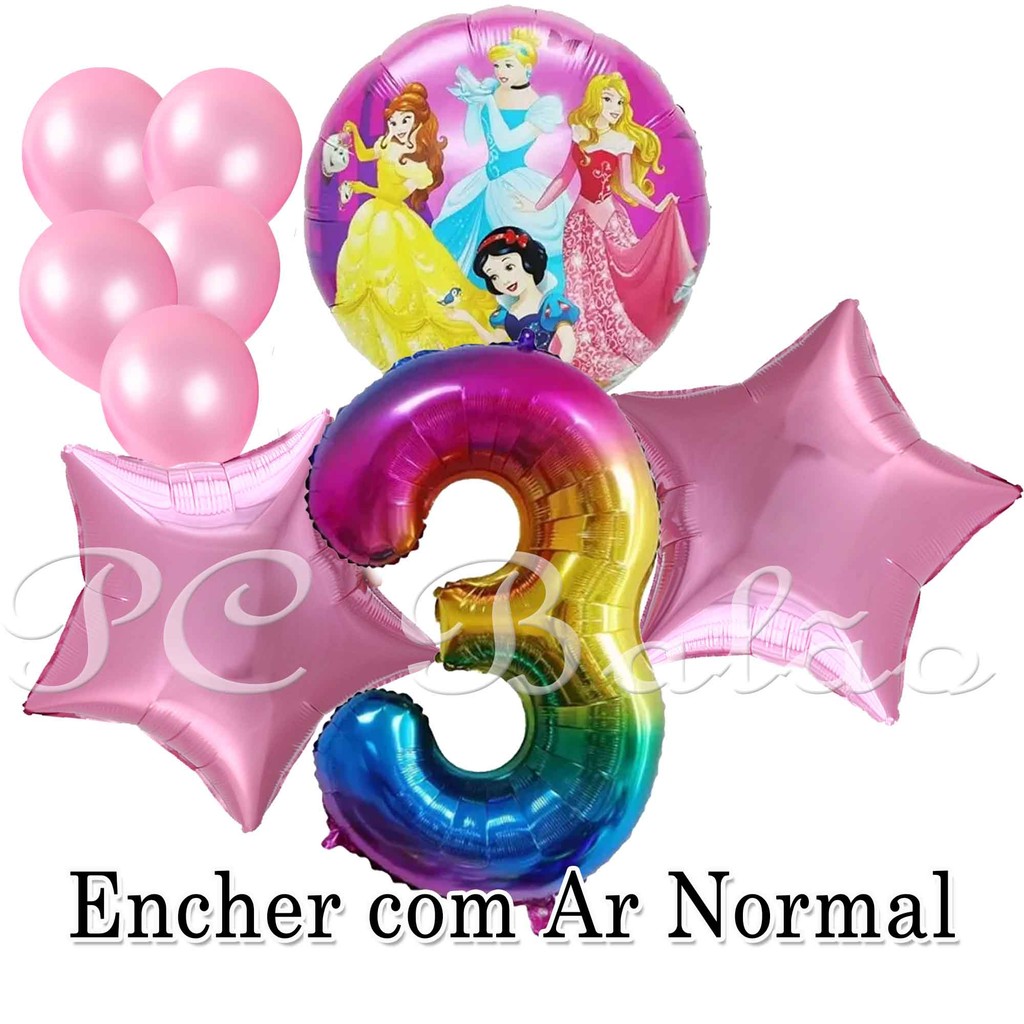 Kit 9 Balão Metalizado 1 PRINCESAS REDONDO 45CM + N° 40CM COLORIDO 2 Estrela + 5 BEXIGA ROSA CLARO