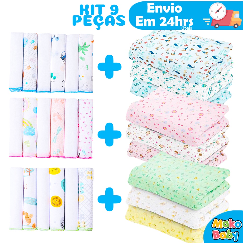 | Kit 9 Peças Enxoval Bebe - 3 Cueiros Flanelados Estampados ou Lisos... este produto | R$ 33,99 | 32% | 4.4/5 | — |