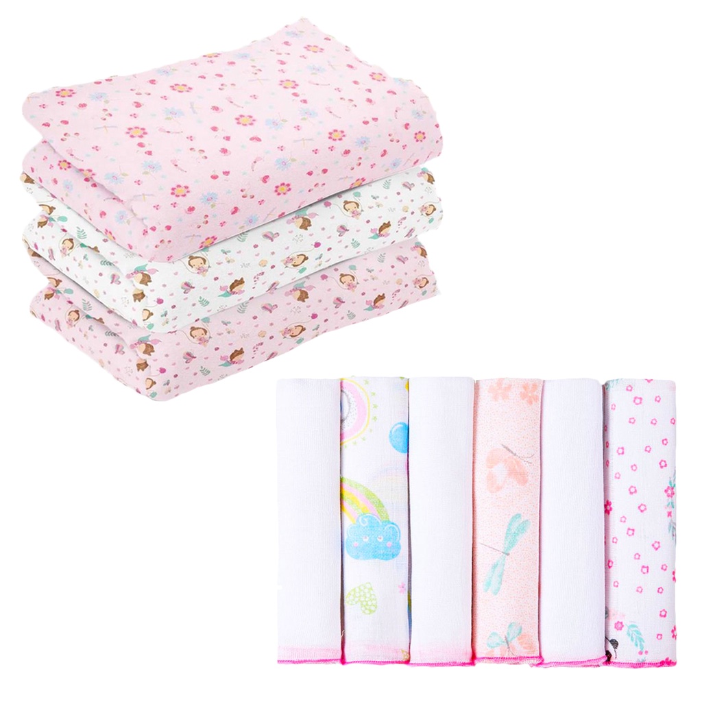 Kit 9 Peças Enxoval Bebe - 3 Cueiros Flanelados Estampados ou Lisos + 6 Paninho de boca 100% algodão