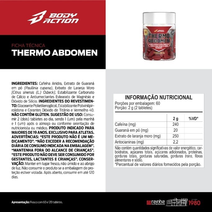 THERMO ABDOMEN® INGREDIENTES: Cafeína, Extrato de Guaraná em pó (Paullinia cupana), Extrato de Laranja Moro (Citrus sinensis (L.) Osbeck), Estabilizante Carbonato de Cálcio e Antiumectantes Estearato de Magnésio. INGREDIENTES DO REVESTIMENTO: Glaceante Polietilenoglicol, Estabilizante Polivinilpirrolidona e Corantes Dióxido de Titânio e Vermelho 40. NÃO CONTÉM GLÚTEN. SUGESTÃO DE USO: Consumir 2 (dois) tabletes ao dia, sendo 1 (um) pela manhã e 1 (um) após o almoço ou conforme orientação de nutricionista ou médico. PRODUTO INDICADO PARA MAIORES DE 19 ANOS. EXCLUSIVO PARA ATLETAS. ADVERTÊNCIAS: “ESTE PRODUTO NÃO É UM MEDICAMENTO”. “NÃO EXCEDER A RECOMENDAÇÃO DIÁRIA DE CONSUMO INDICADA NA EMBALAGEM”. “MANTENHA FORA DO ALCANCE DE CRIANÇAS”. “ESTE PRODUTO NÃO DEVE SER CONSUMIDO POR GESTANTES, LACTANTES E CRIANÇAS”. CONSERVAÇÃO: Manter em lugar fresco, não úmido e ao abrigo de luz. Não consumir o produto se a embalagem de proteção estiver violada. Após aberto, consumir em até 24 horas. _____________________________________ NIGHT ABDOMEN® INGREDIENTES: Carnitina (L-Carnitina), Triptofano (L-Triptofano), Glicina, Cártamo em pó, Colina (Bitartarato de Colina), Magnésio (Óxido de Magnésio), Zinco (Bisglicinato de Zinco), Vitamina B6 (Piridoxina), Cromo (Picolinato de Cromo), Antiumectantes Estearato de Magnésio, Talco Farmacêutico e Dióxido de Silício. INGREDIENTES DA CÁPSULA: Gelatina, Água Potável Filtrada e Corantes Dióxido de Titânio, Azul Brilhante e Vermelho 40. NÃO CONTÉM GLÚTEN. SUGESTÃO DE USO: Sugere-se a ingestão de 2 (duas) cápsulas 1 (uma) vez ao dia, preferencialmente de 30 à 60 minutos antes de dormir. PRODUTO INDICADO PARA MAIORES DE 19 ANOS. ADVERTÊNCIAS: “ESTE PRODUTO NÃO É UM MEDICAMENTO”. “NÃO EXCEDER A RECOMENDAÇÃO DIÁRIA DE CONSUMO INDICADA NA EMBALAGEM”. “MANTENHA FORA DO ALCANCE DE CRIANÇAS”. “ESTE PRODUTO NÃO DEVE SER CONSUMIDO POR GESTANTES, LACTANTES E CRIANÇAS”. CONSERVAÇÃO: Manter em lugar fresco, não úmido e ao abrigo de luz. Não consumir o produto se a embalagem de proteção estiver violada. Após aberto, consumir imediatamente. _____________________________________ Uma nutrição equilibrada tem um papel muito importante na qualidade de vida. Com o ritmo acelerado de muitas pessoas, às vezes, é muito difícil prestar atenção a todos os requisitos que o corpo precisa para estar saudável e forte. Neste sentido, os suplementos cumprem a função de complementar a alimentação e ajudam a obter as vitaminas, minerais, proteínas e outros componentes indispensáveis para o correto funcionamento do organismo. *Este produto é um suplemento dietético, não é um medicamento. Suplementa Ante dietas insuficientes. Consulte seu médico e / ou farmacêutico.