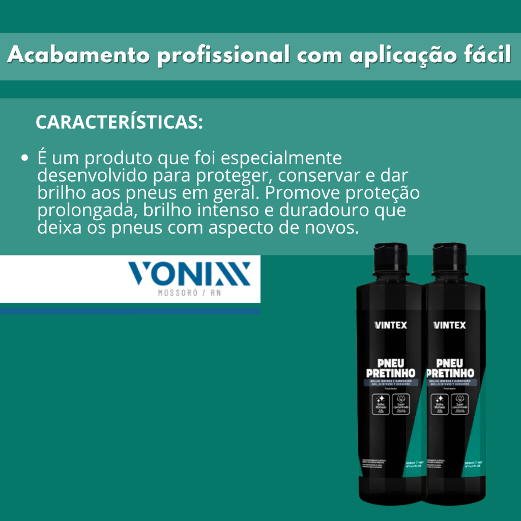 Kit Acabamento Pro Pneu Pretinho Vonixx .....................................................................................................................................INFORMAÇÕES SOBRE O PRODUTO.....................................................................................................................................-O aplicador de produtos para pneus Vintex é indicado para aplicação de produtos para pneus em geral.Possui formato anatômico e de fácil uso com acabamento côncavo que cobre toda a área do pneu..O Pneu Pretinho é um produto que foi especialmente desenvolvido para proteger, conservar e dar brilho aos pneus em geral. Promove proteção prolongada, brilho intenso e duradouro que deixa os pneus com aspecto de novos......................................................................................................................................DÚVIDAS FREQUENTES.....................................................................................................................................Pergunta: Como é embalado o produto?Resposta: Todos os nossos produtos vendidos são embalados em caixas lacradas ou plástico stretch. Em respeito ao meio ambiente 90% das caixas são reutilizadas.Pergunta: Quem faz a entrega?Resposta: A entrega é terceirizada, feita via CORREIOS ou TRANSPORTADORA.Pergunta: O envio é feito em quantos dias?Resposta: Nós enviamos o seu pedido no prazo máximo de 24 horas após a confirmação de sua compra, sendo um dos envios mais rápidos da plataforma.Pergunta: Os produtos são novos ou usados?Resposta: Todos os produtos que trabalhamos são novos e com qualidade garantida......................................................................................................................................