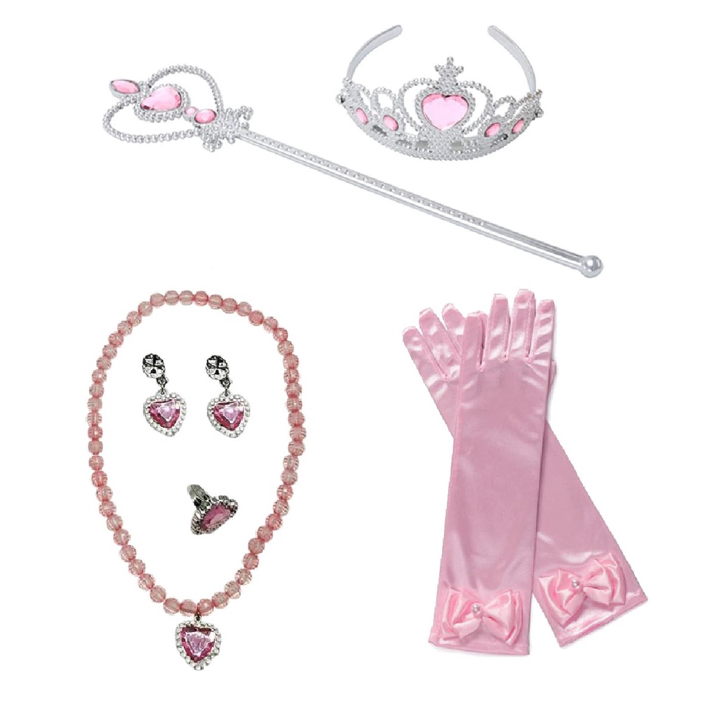 Kit Acessório Festa Beleza Princesa Bela Enfeites Rosa 06 peças - varinha, tiara/coroa, luvas, anel colar e brincos