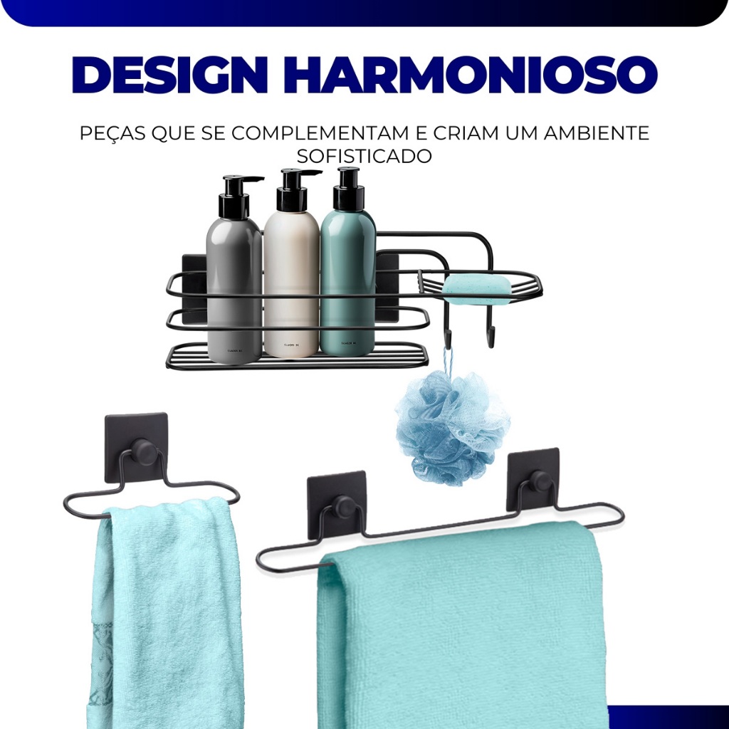 Kit Acessorios 3 Pecas Suporte Toalha Rosto Banho Porta Shampoo Banheiro 3M Sem Furo Preto Arthi