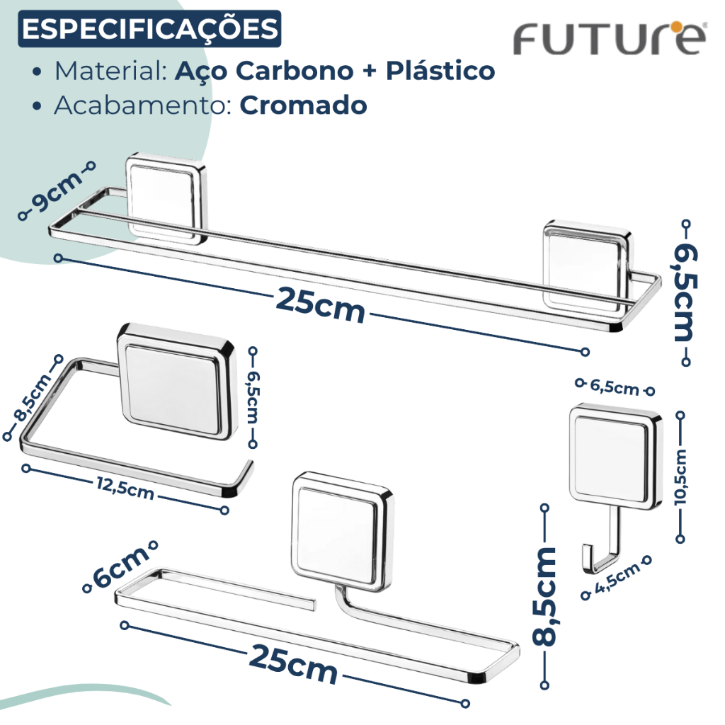 SOBRE O PRODUTO KIT BANHEIRO CROMADO 4 PEÇAS COM ADESIVO NORBOND Acessórios para banheiro com fixação através de adesivo. Possui instalação prática, rápida e sem sujeira, graças ao sistema de adesivo Norbond. Pode ser fixado com facilidade. Posicione no melhor local no banheiro ou no lavabo. Além do tradicional tratamento superficial da Future - onde são aplicadas até 4 camadas de metal - os produtos são revestidos com uma camada extra do protetivo especial Rust Free, garantindo cores vivas e brilhantes, além de maior resistência contra ferrugem. Itens inclusos: 1 Toalheiro Duplo 45cm com Ventosa 1 Gancho com Adesivo 1 Toalheiro 25cm com Adesivo 1 Porta Papel Higiênico com Adesivo RECOMENDAÇÕES Superfícies recomendadas: Cerâmica, porcelanato, mármore, granito, metal liso, vidro, concreto liso, madeira. Não recomendado (pode ser utilizado com parafuso): Paredes pintadas ou com papel de parede (pode danificar a superfície caso necessária a remoção do adesivo). Superfícies irregulares, ásperas, brutas ou com textura grossa. GANCHO Medidas: - Profundidade: 4,5cm - Lagura: 6,5cm - Altura: 10,5cm - Peso: 0,045kg - Capacidade: 0,9kg TOALHEIRO DUPLO Medidas: - Profundidade: 9cm - Lagura: 45cm - Altura: 6,5cm - Peso: 0,324kg - Capacidade: 1,8kg TOALHEIRO 25CM Medidas: - Profundidade: 6cm - Lagura: 25cm - Altura: 8,5cm - Peso: 0,176kg - Capacidade: 0,9kg SUPORTE PAPEL HIGIÊNICO Medidas: - Profundidade: 8,5cm - Lagura: 12,5cm - Altura: 6,5cm - Peso: 0,102kg - Capacidade: 0,9kg ESPECIFICAÇÕES - Máteria Prima: Aço Carbono / Plástico - Cor/Acabamento: Cromado
