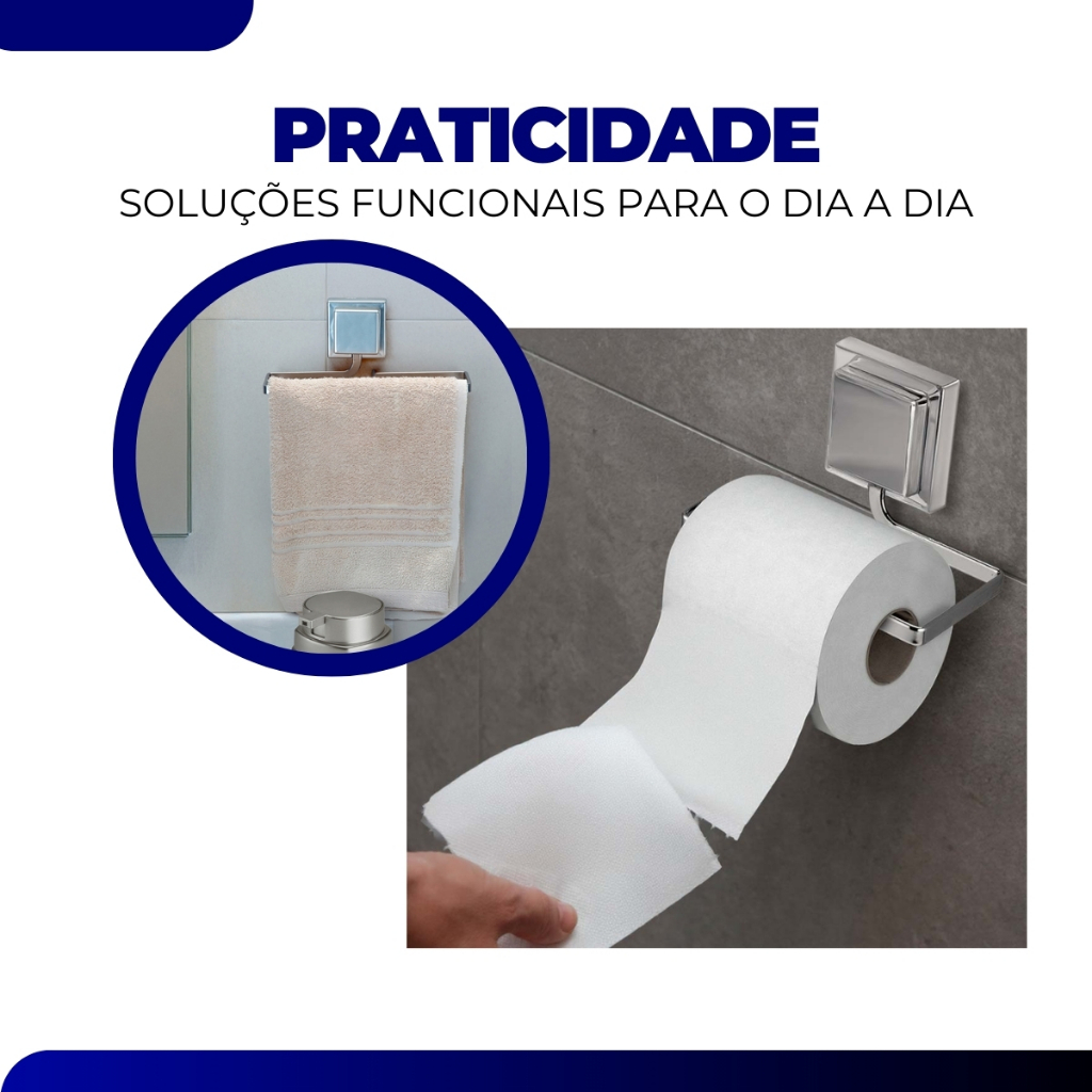 Kit Acessórios Banheiro Porta Toalha Rosto Banho Papeleira Sem Furo Dupla Face 3M Cromado Arthi O Kit Porta Toalha Banho Rosto e Papeleira Cromado é a solução perfeita para quem busca organização e estilo no banheiro. Feito com materiais de alta qualidade, ele oferece durabilidade e resistência ao uso diário. O design moderno na cor preta adiciona sofisticação e combina facilmente com diferentes tipos de decoração. Além de funcional, esse kit traz praticidade ao ambiente, tornando-o mais elegante e organizado. Ideal para quem deseja adicionar personalidade ao banheiro sem abrir mão da funcionalidade. Dimensões: Porta Toalha Banho Piatina 3m • Comprimento: 50,0 cm • Largura: 6,8cm cm • Altura: 9,0 cm Porta Toalha Rosto Piatina 3m • Comprimento: 20,0 cm • Largura: 6,8 cm • Altura: 8,0 cm Papeleira Piatina 3m • Comprimento: 13,0 cm • Largura: 9,0 cm • Altura: 7,7 cm FAQ: 01. O Suporte é Fácil de Montar? Sim, o suporte vem com um manual de instruções claro e todas as peças necessárias para uma montagem simples e rápida. 02. O Toalheiro Aguenta Toalhas do Estilo Banhão? O suporte é projetado para acomodar a maioria das toalhas de tamanho e peso padrão. Certifique-se de saber a dimensão e o peso das tolhas antes de usar o produto. 03. O Material é Resistente à Corrosão? Sim, o aço revestido oferece proteção contra corrosão e garante longa durabilidade, mesmo em ambientes úmidos. Conteudo da Embalagem: • 01 Porta Toalha Banho Piatina 3m • 01 Porta Toalha Ranho Piatina 3m • 01 Papeleira Piatina 3m Importante: Garantia de 3 Meses. Valor do Kit. Imagens Meramente Ilustrativas. Não nos responsabilizamos pelo mau uso do produto