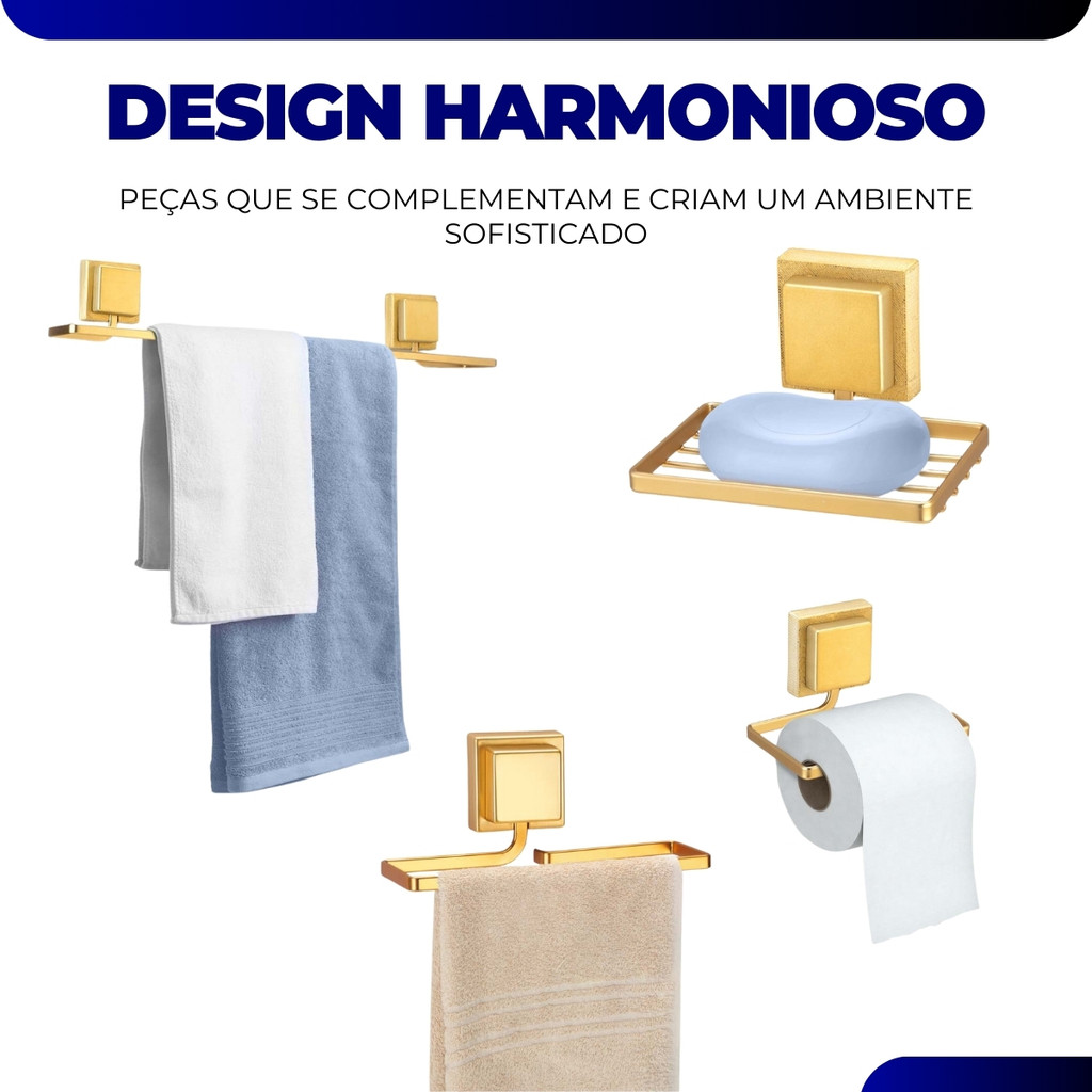 Kit Acessórios Banheiro Porta Toalha Rosto Banho Saboneteira Papeleira Dupla Face 3M Dourado Arthi