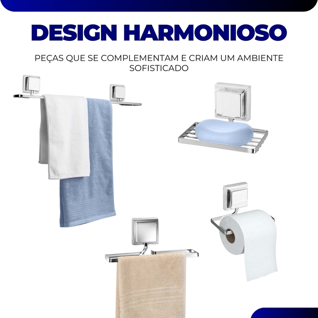 Kit Acessórios Banheiro Porta Toalha Rosto Banho Saboneteira Papeleira Sem Furo 3M Cromado Arthi