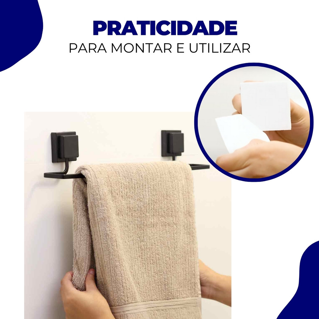 Kit Acessórios Banheiro Porta Toalha Rosto Banho Sem Furo Dupla Face 3M Preto Arthi