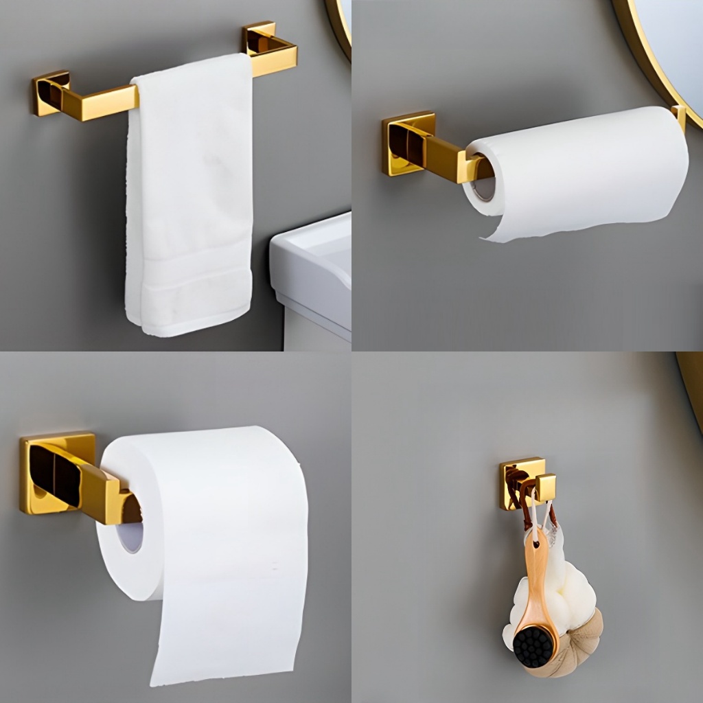Todos as peças tem uma camada de Galvanoplastia, o que protege contra ferrugem. Produto de extrema qualidade! A dimensão de cada peça consta na imagem. Cor: Dourado Material: Aço Inoxidável 304 Todas as peças tem a espessura de 1 cm. Tipo de Fixação: Dupla com Parafusos Itens inclusos: Porta papel Higiênico, Cabide, Porta toalha de rosto e Porta toalha de banho. Acompanha também: Parafusos e Buchas para instalação. Garantia do vendedor: 3 meses