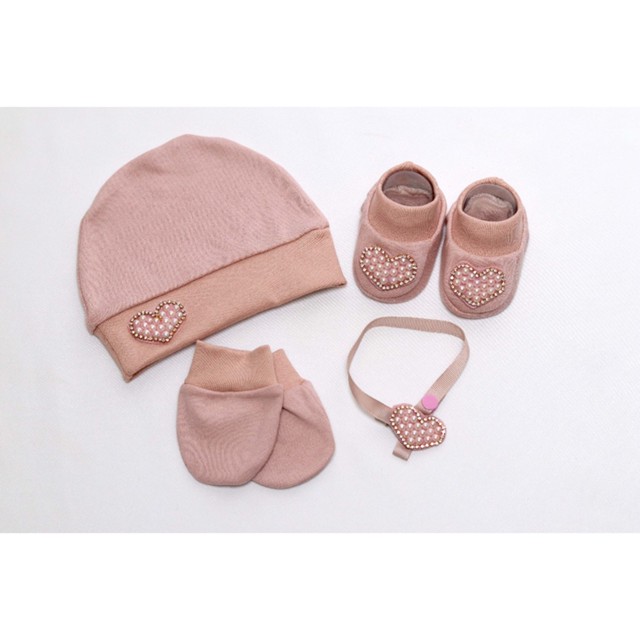 KIT ACESSORIOS BEBE COM TOUCA LUVAS SAPATINHO E PREGADOR DE CHUPETA TEMA CORAÇÃO