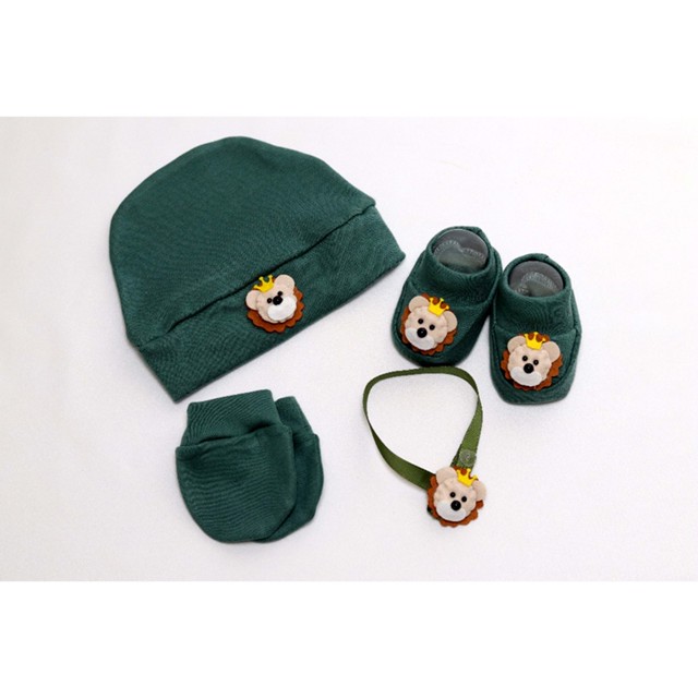 KIT ACESSORIOS BEBE COM TOUCA LUVAS SAPATINHO E PREGADOR DE CHUPETA TEMA LEAO