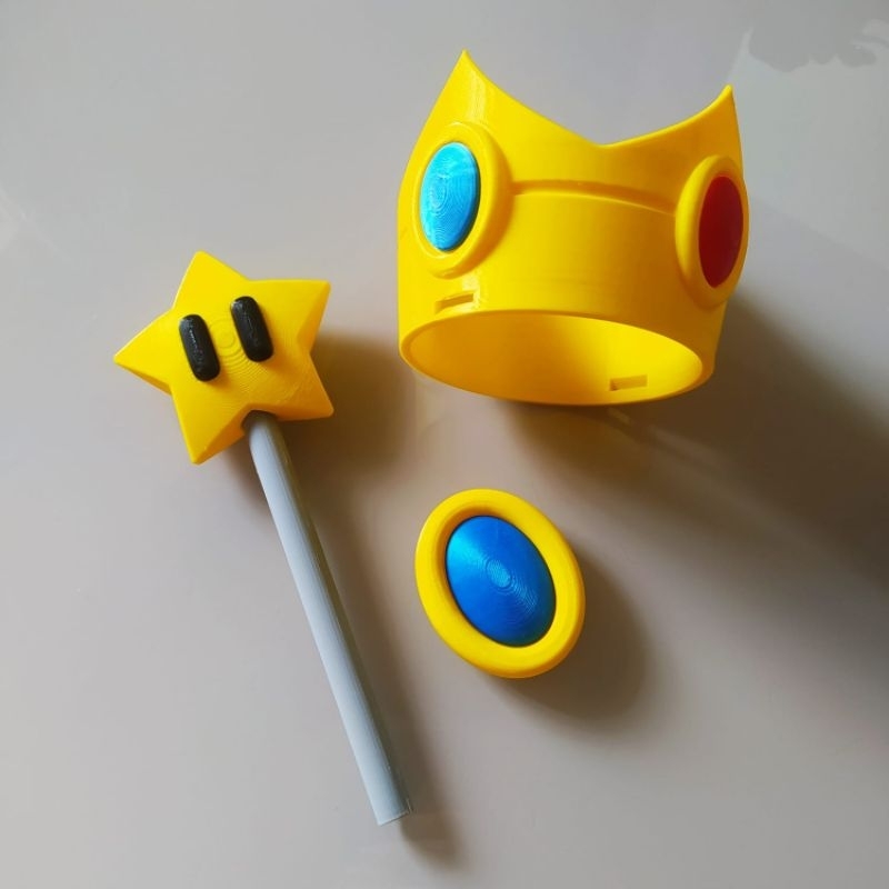 Transforme-se na Princesa Peach ou Daise com este kit de fantasia completo! Inclui uma coroa real, uma varinha mágica em formato de estrela e um broche elegante. Ideal para cosplay, festas de aniversário ou qualquer evento onde você queira brilhar como a verdadeira princesa do Reino do Cogumelo. Conteúdo do Kit: * 1 Coroa Princesa Peach que é possível encaixar em tiara ou presilha ---> Largura: 12cm - Altura: 10cm Obs: A coroa possui ganchos para fixar com linha ou barbante em uma tiara para cabelo ou presilha. * 1 Broche Princesa é possível encaixar em cordão ou presilha ---> Largura: 5cm - Altura: 8cm * 1 Varinha com Estrela ---> Estrela com 8cm e cabo com cerca de 20cm Todas as peças são impressas em impressora 3D. NÂO É NADA PINTADO. ? Nossas peças são produzidas em impressoras 3d com ABS premium. ? Possui marcas de camadas comuns em impressão 3d. ? Para limpeza utilize um pano úmido.