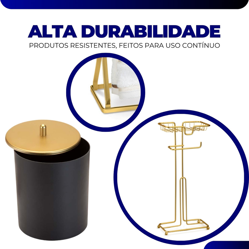 Kit Acessorios Lavabo Banheiro Lavabo Toalha Rosto Porta Papeleira Celular Luxo Dourado/Preto Arthi