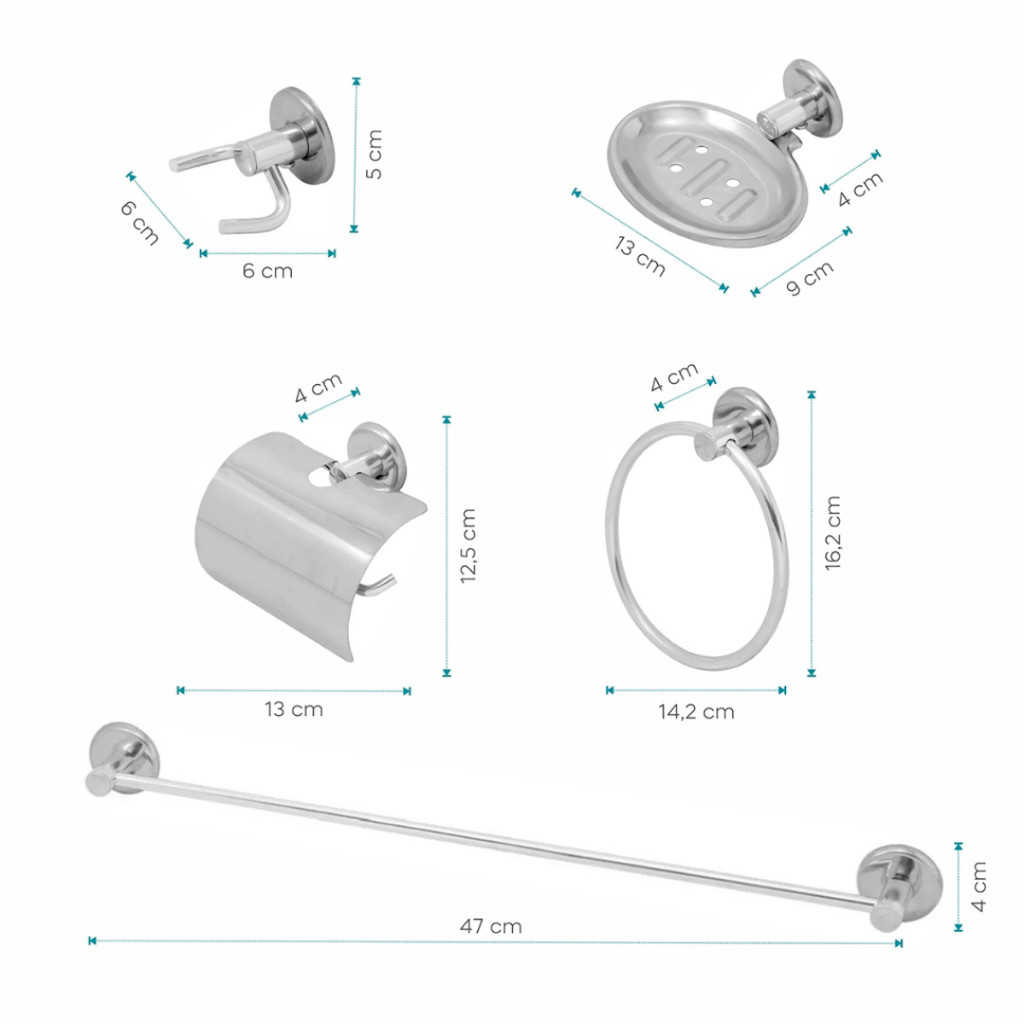 Kit para Banheiro Stander com 5 Peças Dupla Fixação | Fixadores em Alumínio O Kit para Banheiro Stander é a escolha ideal para quem busca durabilidade, praticidade e um acabamento moderno. Produzido com materiais de alta qualidade, ele oferece resistência à umidade e um visual sofisticado para seu ambiente. Itens Inclusos: 01 Porta-toalha de banho 01 Porta-toalha de rosto 01 Saboneteira 01 Papeleira (porta-papel higiênico) 01 Cabide duplo Composição dos Materiais: Aço Inox: Papeleira e saboneteira Alumínio: Porta-toalhas (banho e rosto) e cabide duplo Canoplas: Fabricadas em aço inox A combinação entre aço inox e alumínio garante alta durabilidade, resistência à corrosão e um excelente acabamento. Sistema de Fixação: Dupla Fixação: Mais firmeza e segurança na instalação Fixadores em alumínio Acompanha buchas e parafusos para instalação Perguntas Frequentes 1. O produto possui garantia? Sim. Todos os nossos produtos possuem garantia contra defeitos de fabricação. 2. O produto está disponível para pronta entrega? Sim. Todos os itens anunciados estão em estoque e prontos para envio imediato. 3. O envio é rápido? Sim. Realizamos envios diariamente para garantir maior agilidade na entrega. Política de Troca e Devolução Para evitar contratempos, antes de concluir sua compra, atente-se aos seguintes pontos: Leia atentamente a descrição e ficha técnica do produto Verifique as dimensões e se há espaço adequado para instalação no local desejado No ato do recebimento, recuse a encomenda e entre em contato conosco caso identifique: Produto avariado durante o transporte Embalagem violada Itens ou acessórios faltantes Produto divergente do pedido realizado ⚠️ Atenção! Antes de finalizar sua compra, confirme se o endereço cadastrado está correto. Isso garante uma entrega rápida e sem imprevistos.