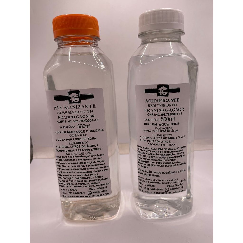 uso em água a ser tratada tanto para aquários, lagos, fontes, tanques, piscinas, criatórios. Uso em águas doces. ACIDIFICANTE 500ML- Indicado para correção do pH do aquário quando o mesmo se encontra acima do desejado, proporcionando condições apropriadas para peixes ornamentais que habitam águas de pH baixo. -Modo de uso: Usar uma gota para cada litro de água a ser tratado.Ao usar desligar filtragem, manter somente aeração (oxigenação). Repetir 2 horas após se necessário com a mesma dosagem e procedimento, descendo lentamente o pH para evitar uma mudança brusca que pode resultar em morte dos peixes. DILUIR EM UM RECIPIENTE A QUANTIDADE A UTILIZAR COM A ÁGUA A SER TRATADA E ESPALHE POR TODO AQUÁRIO/LAGO. -1 embalagem de 500 ml é suficiente para o condicionamento de ate 10000 litros de água a ser tratada. - Composição: Ácido clorídrico, água bi-filtrada e veiculo qsp. ALCALINIZANTE 500 ml SUBIR, ELEVAR O Ph 1 tampa cheia para 200 litros de água a condicionar. -Uso em água a ser tratada tanto para aquários, lagos, fontes, tanques, piscinas, criatórios. Uso em águas doces, marinhas ou salobras. - Indicado para correção do pH do aquário quando o mesmo se encontra abaixo do desejado, proporcionando condições apropriadas para peixes ornamentais que habitam águas de pH elevado. (Ciclideos africanos, Molinezia, Platy, etc) -Modo de uso: Usar uma gota para cada litro de água a ser tratado.Ao usar desligar filtragem, manter somente aeração (oxigenação). Repetir 2 horas após se necessário com a mesma dosagem e procedimento, subindo lentamente o pH para evitar uma mudança brusca que pode resultar em morte dos peixes. DILUIR A QUANTIDADE A UTILIZAR EM UM RECIPIENTE A PARTE COM A ÁGUA A TRATAR ESPALHANDO POR TODA A SUPERFÍCIE. - Composição: Carbonato de sódio, água bi-filtrada e veiculo qsp -1 embalagem de 500 ml é suficiente para o condicionamento de ate 10000 litros de água a ser tratada. São duas unidades com 500 ml cads suficiente para condicionamento de até 10 mil litros cada. alcalinizante para elevar o pH e acidificante para abaixar o ph
