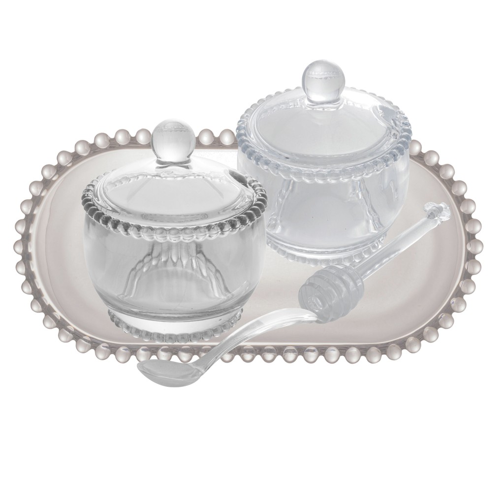 Kit Açucareiro, Meleira e Prato Oval Pearl Lapidação em Bolinhas - Wolff