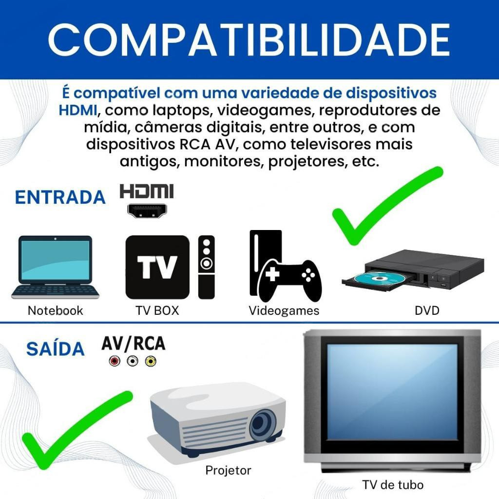 | kit Adaptador mini Conversor 1080p Hdmi P/ Vídeo Composto Av Rca + ... este produto | R$ 45,00 | — | 5.0/5 | — |