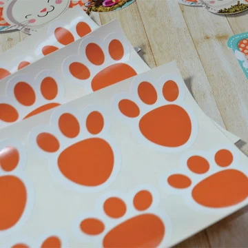 Pegadas de Coelho e cenoura Esses adesivos imitam as pegadas do coelho e podem ser usados para criar trilhas divertidas ou decorar espaços. 102 unidades 100 unidades de pegadas tamanho de 6cm cada unidade e 2 cenoura adesivo vinil de fácil remoção