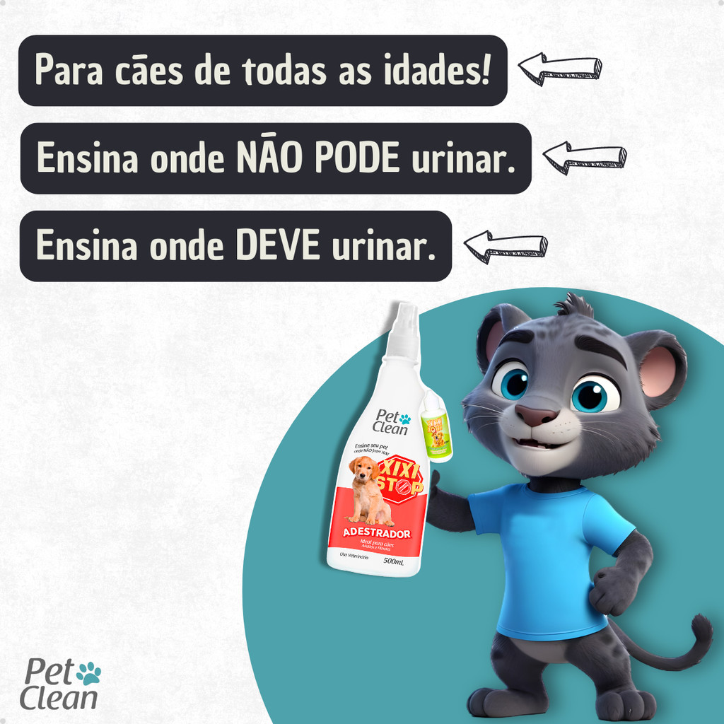 O KIT ADESTRAMENTO É INDICADO PARA GATOS? Não, é ideal apenas para cães de todos os portes e idades. QUANTOS DIAS DEMORA PARA ENSINAR O CACHORRO A PARAR DE MORDER? Não há uma data fixa, depende muito da raça e do temperamento do filhote. No entanto, recomendamos para que o processo seja efetivo você deve repetir o uso diariamente por dias à semanas, se precisar. ONDE APLICAR O BITE STOP? Aplique o produto onde o seu pet esteja querendo morder ou destruir, isso pode ser sofás, chinelos, controles remoto, pés de cadeira ou até mesmo ele próprio. Salientamos que se ele estiver mordendo a si mesmo, o spray amargante é perfeitamente indicado! O XIXI STOP SERVE PARA CÃES VELHOS? Sim! No entanto, para cachorros velhos, por já terem costume de urinar em um certo local, pode ser mais difícil. Recomendamos a repetição do procedimento diariamente para a aprendizagem do seu amigo! Treine o seu cachorro a parar de destruir e fazer xixi em locais inapropriados! Um dos maiores desafios de donos de cães, principalmente de filhotes, é ensiná-los a fazer xixi em lugares certos e o que eles NÃO podem destruir.. É uma situação ruim que todo dono dos peludinhos já passou por isso... Mas você pode evitar tudo isso apenas com o Kit Adestramento para Cães. O Kit Adestramento treina o seu cachorro a parar de morder, lamber e também parar de fazer xixi em locais indesejados. O sabor do spray é extremamente desagradável o que faz com o que o cachorro se desencoraje para continuar mordendo objetos, ou até mesmo a si próprio, já o Kit Educador Sanitário possui um odor repelente e um atrativo, que indica onde o seu pet pode fazer ou não o xixi. BENEFÍCIOS DO KIT ADESTRADOR: - Ensina o cachorro onde ele não deve morder. - Eficiente contra lambeduras. - Eficaz contra destruição de objetos. - Fácil de usar e seguro. - Não é tóxico, apropriado para filhotes. - Ensina onde o cachorro NÃO PODE urinar. - Ensina onde o cachorro DEVE urinar. - Indicado para todos tipos de cães. INFORMAÇÕES TÉCNICAS: Produto: Kit Adestramento para Cães. Marca: Pet Clean Tipo: Adestramento e Treinamento Animal: Cachorros Porte: Filhotes Raça Específica: Não Sexo Específico: Não Itens Inclusos: 1 Spray Bite Stop 120ml + 1 Frasco Xixi Stop 500 ml + 1 Frasco Pipi Certo 30 ml Apresentação: Frasco em Plástico Composição Spray Bite Stop: Benzoato de Denatônio, óleo Cítrico e Veículo. Composição Xixi Stop: Metil Nonil Cetona, essência, veículo Q.S.P. Pipi Certo: Essência, Bicarbonato de Amônio e Veículo Q.S.P. MODO DE USAR Para usar é muito simples: basta espirrar o spray nos locais onde o seu cachorro costuma morder ou lamber. Quando ele colocar a boca e sentir o gosto amargo do spray, ele automaticamente irá retirar a boca. Deste modo, uma vez que o procedimento seja repetido, o cachorro será treinado a não morder ou lamber mais objetos! Pulverizar o educador Xixi Stop da PetClean uma, ou duas vezes ao dia, no local onde não se deseja que o seu animal faça as suas necessidades. Se necessário, limpe o local ou objeto, utilizando um pano seco, não devendo remover o produto enquanto sua ação for efetiva. É importante não mascarar o odor com outros produtos ou alimentos. Aplique 5 gotas do XIXI PODE em um papel absorvível, de preferência tapete higiênico e coloque no local onde o cão deverá aprender a urinar. Leve o cão até esse local todos os dias para sentir o cheiro. Repita o procedimento. PRECAUÇÕES Evite contato com os olhos e mucosas do animal. Manter longe de alimentos e produtos domésticos. Manter em locais secos, fora do alcance de crianças e animais domésticos.