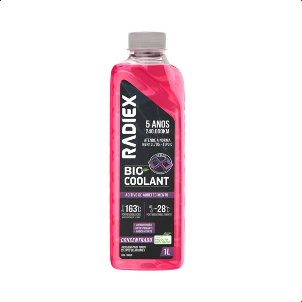 Kit Aditivo Rosa Concentrado Com Água Desmineralizada Radiex BIO COOLANT OCTAGEL - ADITIVO ARREFECIMENTO - ORGANICO - ANTIFERVURA - ANTICONGELAMENTO - ANTICORROSAO - ANTIESPUMANTE - ANTICAVITANTE - NORMA NBR.13705 - TIPO C - DURACAO 5 ANOS OU 240.000 KM - ROSA - 16X1 NORMAS: ABNT NBR 13.705 TIPO C - ASTM D-3306 - GMW17918 GARANTIA: 3 meses