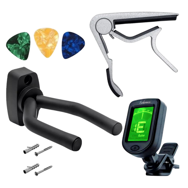 Kit Afinador Clip, Capotraste,Suporte parede Violão e 3 palhetas Contém: - Afinador Clip - Capotraste NV Prata - Suporte parede Violão - 3 Palhetas