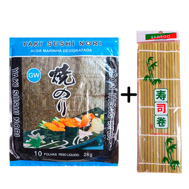 Kit composto por: 1 Pacote de Alga Marinha 10 folhas GW 28g 1 Esteira de Bambu para o preparo do sushi 24cmX24cm