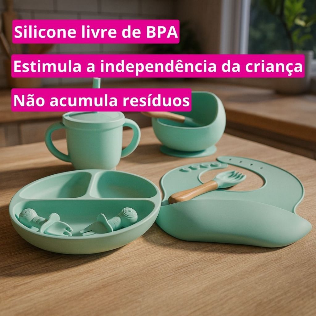 Kit Alimentação Infantil Silicone 8 Peças Prato Tigela Copo Babador Colher Garfo Infantil