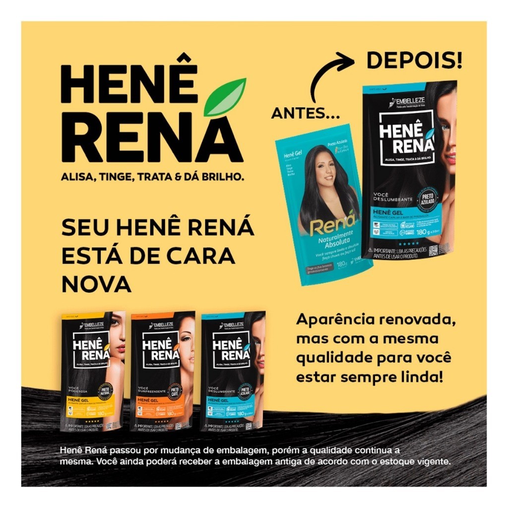 Alisante Henê Gel Rená Preto Azulado Pouch 180g Embelleze - 3 Unidades O Henê Rená Preto Azulado foi feito para quem ama cabelo liso e preto e sonha com um efeito duradouro e natural. Ele transforma os seus cabelos progressivamente, garantindo maciez e um balanço de dar inveja. A sua fórmula, além do poder de alisamento e da força do jaborandi, traz a hidratação do karité, para dar muito mais brilho aos fios. Sua nova e exclusiva fragrância vai deixar seu liso mais perfumado e você ainda mais confiante. E então, preparada para os elogios? Benefícios: Nutrição e megabrilho. Solução definitiva. Toque aveludado e embalagem mais prática. Dê adeus à chapinha, escova e secador. * Como Aplicar: 1 - Aplique o Henê gel Rená, mecha por mecha. 2 - Puxe com pente fino, da raiz às pontas, esticando bem os fios. Cubra com uma touca plástica por 60 minutos (o efeito será o mesmo se o tempo for maior). 3 - Enxágue bem os cabelos e lave-os com shampoo e condicione. 4 - Se você quer um efeito bem liso, pode fazer uma escova. E se você quer um penteado ondulado, é só deixar os cabelos secarem em bobs. 5 - Aconselhamos 2 aplicações por semana até atingir o resultado desejado. Retoque: Ao fim do alisamento, que varia de acordo com o tipo de cabelo e o resultado desejado, faça apenas o retoque na raiz de 15 em 15 dias, evitando levar o Henê Rená para as pontas. Precauções: Este produto é incompatível com qualquer outro tipo de relaxante, alisante, colorações à base de amônia e descolorantes. Se você deseja usar estes produtos, deve esperar 6 meses, cortar todo cabelo tratado com Rená e aplicar somente na parte crescida e virgem do cabelo. Se você coloriu, descoloriu ou usou outro tipo de alisante, aguarde 30 dias antes de aplicar o Henê Gel Rená. Não é recomendado para gestante. Antes de aplicar faça o Teste de Mecha Separe uma mecha no alto da cabeça, aplique o Henê conforme indicação, com auxílio de um pente plástico. Penteie a mecha levando o produto nos fios até as pontas, preservando meio centímetro da raiz. Deixe agir por uma hora penteando a cada cinco minutos verificando se os fios estão resistentes e sem danificações. Após o tempo de pausa, enxágue completamente todo o Henê dos fios, lave com shampoo, condicione e finalize como de costume. Caso os fios apresentem sensibilidades, quebra, ruptura, durante o Teste de Mecha, interrompa imediatamente a aplicação. Faça repetidas reconstruções e depois de um mês repita o Teste de Mecha. Composição: AQUA, ZEA MAYS (CORN) STARCH, MANIHOT UTILISSIMA STARCH, AMMONIUM CHLORIDE, PYROGALLOL, CUPRIC CHLORIDE, SODIUM BENZOATE, PARFUM, LINALOOL, FERROUS SULFATE, SODIUM HYDROXIDE, CI 77266, BUTYROSPERMUM PARKII BUTTER, PILOCARPUS PENNATIFOLIUS LEAF EXTRACT. Resultado: Cabelão liso escorrido, preto e com brilho pra lacrar!