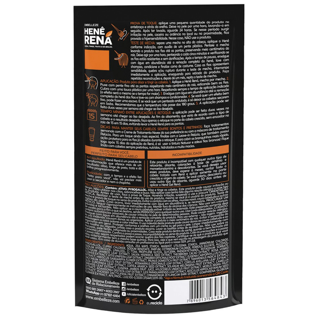 Alisante Henê Gel Rená Preto Café Pouch Embelleze 180g - 3 Unidades Uma atitude que vem do jeito de ser. Vem da vontade de se destacar e de encantar. Uma Exuberante Morena cheia de beleza, força e paixão. Naturalmente Surpreendente. Assim como esse Henê Rená que agora é seu mais fiel companheiro, aquele que vai trazer para você o poder do liso, a personalidade da cor e o fascínio do brilho. Afinal toda Morena Surpreendente nasceu para brilhar! Benefícios: Nutrição e megabrilho. Solução definitiva. Toque aveludado e embalagem mais prática. Dê adeus à chapinha, escova e secador. Como Aplicar: 1 - Aplique o Henê gel Rená, mecha por mecha. 2 - Puxe com pente fino, da raiz às pontas, esticando bem os fios. Cubra com uma touca plástica por 60 minutos (o efeito será o mesmo se o tempo for maior). 3 - Enxágue bem os cabelos e lave-os com shampoo e condicione. 4 - Se você quer um efeito bem liso, pode fazer uma escova. E se você quer um penteado ondulado, é só deixar os cabelos secarem em bobs. 5 - Aconselhamos 2 aplicações por semana até atingir o resultado desejado. Retoque: Ao fim do alisamento, que varia de acordo com o tipo de cabelo e o resultado desejado, faça apenas o retoque na raiz de 15 em 15 dias, evitando levar o Henê Rená para as pontas. Precauções: Este produto é incompatível com qualquer outro tipo de relaxante, alisante, colorações à base de amônia e descolorantes. Se você deseja usar estes produtos, deve esperar 6 meses, cortar todo cabelo tratado com Rená e aplicar somente na parte crescida e virgem do cabelo. Se você coloriu, descoloriu ou usou outro tipo de alisante, aguarde 30 dias antes de aplicar o Henê Gel Rená. Não é recomendado para gestante. Antes de aplicar faça o Teste de Mecha Separe uma mecha no alto da cabeça, aplique o Henê conforme indicação, com auxílio de um pente plástico. Penteie a mecha levando o produto nos fios até as pontas, preservando meio centímetro da raiz. Deixe agir por uma hora penteando a cada cinco minutos verificando se os fios estão resistentes e sem danificações. Após o tempo de pausa, enxágue completamente todo o Henê dos fios, lave com shampoo, condicione e finalize como de costume. Caso os fios apresentem sensibilidades, quebra, ruptura, durante o Teste de Mecha, interrompa imediatamente a aplicação. Faça repetidas reconstruções e depois de um mês repita o Teste de Mecha. Resultado: Cabelão liso escorrido, preto e com brilho pra lacrar!