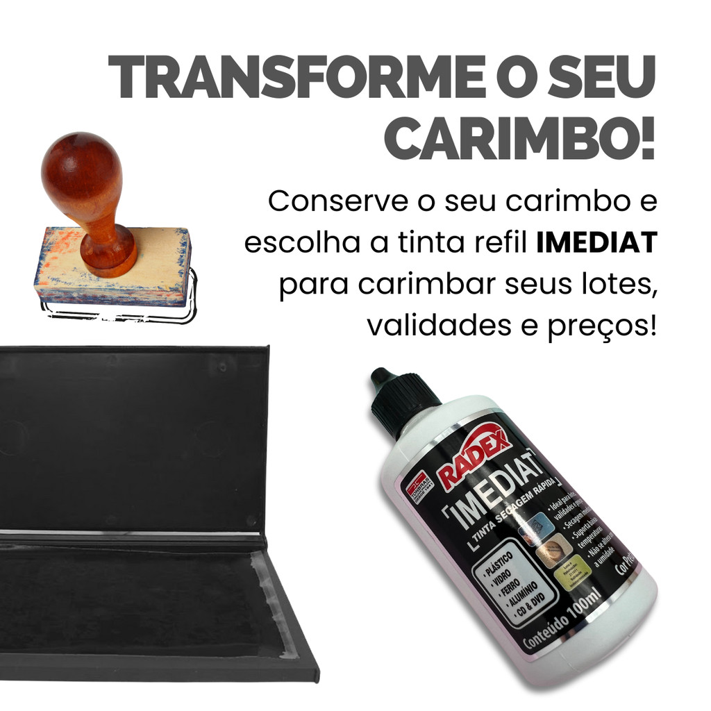 Almofada de Carimbo N4 sem tinta, ideal para uma aplicação limpa e uniforme de tinta em superfícies diversas. Acompanha um frasco de tinta preta de secagem rápida, especialmente formulada para carimbar plásticos com precisão e durabilidade. A solução perfeita para quem busca praticidade e qualidade em cada carimbada! ESPECIFICAÇÕES TÉCNICAS ALMOFADA: Almofada N4 Sem Tinta Dimensões do espaço interno: 16,8 x 9,8 cm ESPECIFICAÇÕES TÉCNICAS TINTA: Composição: Resina, Corante e Solvente. Cor da Tinta: Preta VOCÊ RECEBERÁ: 1 Unidade De Almofada De Carimbo Radex N4 1 Unidade De Tinta Para Carimbo Imediat Radex 100ml
