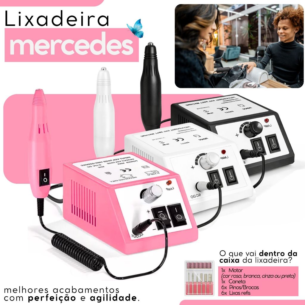 ENVIO IMEDIATO Preço especial para as primeiras vendas – APROVEITE! Trabalhamos com qualidade profissional, para que você compre com total segurança e receba produtos confiáveis, aprovados por especialistas da área, com garantia e assistência técnica. Itens inclusos no kit: 1 Cabine SUN com visor ( escolha a cor na hora da compra na variação do anúncio) 1 Lixadeira elétrica profissional Mercedes bivolt + kit com 6 brocas e 6 rolinhos de lixa (cor enviada aleatoriamente - Rosa, cinza, branca) Registro ANVISA: MS 8.05.630-4 3 Géis UV (cor e marca enviada aleatoriamente) 1 Pó acrílico 100 Tips de alta qualidade (modelo enviado aleatoriamente) 1 Lixa banana ou diamante 100/180 lavável 1 Lixa bloco 1 Cola 10 ml super aderente 1 Fibra de cordão com 2 metros 5 Presilhas C para formação de curvatura em alongamentos 1 Prep bactericida 120 ml 1 Pincel de aplicação 10 Moldes dourados 1 Copo de mistura 1 Caneta óleo de cutícula 1 Pinça de precisão 1 Espanador pompom 1 Cortador de tips Itens extras enviados: 1 Primer 1 Top coat 1 Esmalte em gel (cor enviada aleatoriamente) 1 Manual de uso com orientações completas (solicitar no chat após a compra) Informações importantes: Todos os aparelhos são bivolt, funcionando automaticamente em 110V e 220V. O kit acompanha todos os itens descritos, sem surpresas. Todos os equipamentos são testados antes do envio e possuem garantia contra defeito de fabricação. Marcas podem variar conforme disponibilidade de estoque, mantendo sempre o padrão de qualidade profissional. Envio rápido e seguro. Compre com confiança.