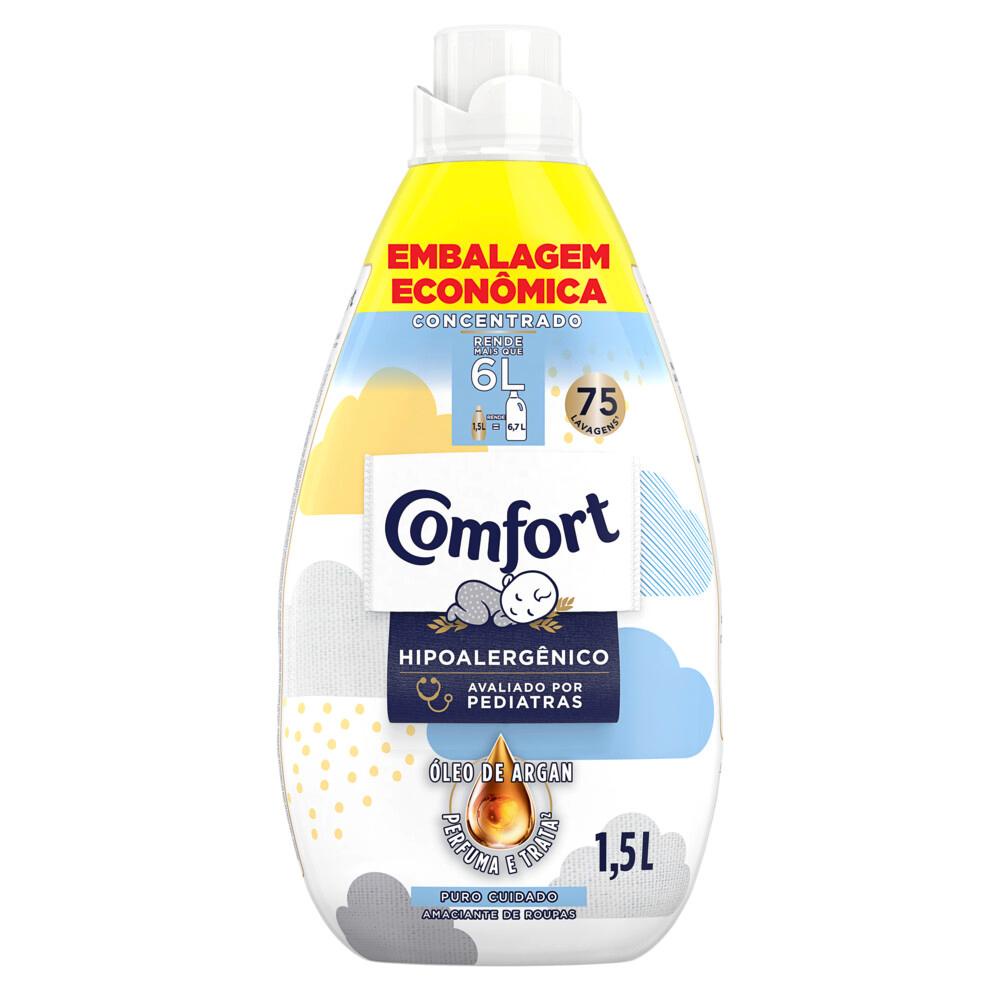 Kit Amaciante Comfort Concentrado Puro Cuidado Intense 1,5l + 2 Refis 900ml Comfort Puro Cuidado é mais que um amaciante, é o tratamento hipoalergênico mais recomendado pelas mamães, pois sua fórmula além de ser hipoalergênica é dermatologicamente testada por pediatras, dermatologistas e outros profissionais da saúde. Dessa forma, o Amaciante Concentrado Comfort Intense Puro Cuidado é indicado para ser usado em roupas de bebês e de pessoas com peles sensíveis e delicadas. Sua nova fórmula com extrato de algodão e penetra profundamente nas fibras do tecido durante a lavagem, deixando-as com uma maciez irresistível, toque gentil e com todo cuidado que as peles sensíveis merecem. Sua fragrância foi feita especialmente para transmitir o toque de macio e suave das roupas, além de sua fórmula ser livre de corantes e das microcápsulas de perfume, componentes com alto potencial de irritabilidade para as peles mais delicadas. Os ingredientes de Comfort Puro Cuidado são capazes de alinhar e proteger o tecido, reduzindo o atrito entre as fibras de suas roupas durante o processo de lavagem. O tratamento intensivo de Comfort funciona da mesma forma que um condicionador para cabelos: alinha os fios, mantém sua forma e ajuda a controlar a quebra das fibras, reduzindo futuros danos nas peças. Com as fibras das roupas seladas com Comfort Puro Cuidado as roupas ficam livres de bolinhas, conservam a sua forma e cor, como se ela estivesse novinha. * Kit Contém: 1 Amaciante Comfort Concentrado Puro Cuidado Intense 1,5l 2 Refis Amaciante de Roupa Comfort Concentrado Puro Cuidado Intense 900ml cada * Compre produtos Comfort.