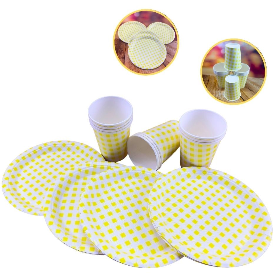 KIT AMARELO XADREZ 10 PRATOS+10 COPOS DE PAPEL PRATOS 15 cm COPO 200ML Os pratinhos trazem uma elegância e diversão para você. Ideal para festas juninas.