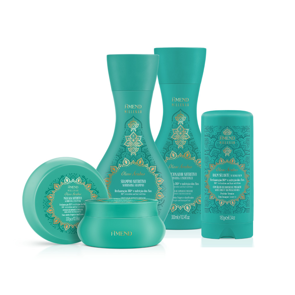 Neste anúncio tem: 01 SHAMPOO MILLENAR ÓLEOS ÁRABES 300ML 01 CONDICIONADOR MILLENER ÓLEOS ÁRABES 300ML 01 MÁSCARA MILLENAR ÓLEOS ÁRABES 300G 01 BALM SELANTE MILLENAR ÓLEOS ÁRABENS 180G AMEND MILLENAR | Óleos Árabes Inspirados pelos rituais de beleza da cultura milenar árabe, com óleo de Pistache e o exclusivo Mass Replenish Complex* CARACTERISTICA Possui uma rica combinação de óleo de Damasco, óleo de Pistache e o exclusivo Mass Replenish Complex*, que garantem uma limpeza suave, restauração completa dos fios, garantindo nutrição profunda, hidratação intensa e reconstrução dos fios danificados, além de proteger os cabelos contra as agressões causadas pela poluição, reduzir o frizz e fortalecer os cabelos, prevenindo a quebra e as pontas duplas. Os cabelos ficam saudáveis, macios, sedosos e com um brilho radiante. PRINCIPIO ATIVO Óleo de Damasco, Óleo de Pistache e Mass Replenish Complex* MODO DE USO SHAMPOO: Aplicar nos cabelos molhados, massageando os fios com as pontas dos dedos. Enxágue e repita a operação. MÁSCARA: Após lavar os cabelos com o Shampoo Amend Millenar Óleos Árabes, retire o excesso de água com uma toalha e aplique a máscara do comprimento dos fios até as pontas, massageando mecha por mecha. Deixe agir por 03 minutos. Enxágue bem. Se desejar, aplique o condicionador para selar as cutículas. CONDICIONADOR: Aplicar nos cabelos molhados, após o uso do Shampoo ou da Máscara Amend Millenar Óleos Árabes. Evitar aplicar na raiz. Massageie os fios suavemente e enxágue bem. BALM: Após lavar os cabelos com a linha Amend Millenar Óleos Árabes, aplique o Balm Selante nos cabelos molhados do comprimento dos fios até as pontas, evitando a raiz. Não enxaguar. Finalize como de costume.