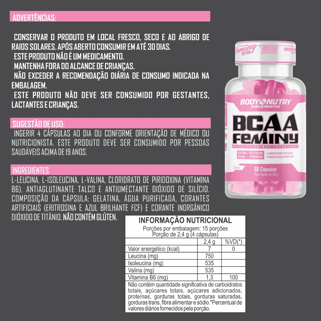 **KIT BCAA 3000 + BCAA FEMINY – RECUPERAÇÃO E SUPORTE PARA TODOS OS OBJETIVOS!** 💪🌸 O **Kit BCAA 3000 + BCAA Feminy** foi desenvolvido para oferecer suporte completo aos seus treinos, garantindo **energia, recuperação e proteção muscular**, atendendo tanto às necessidades gerais quanto às específicas do público feminino. --- ### **O Kit Inclui:** 1. **BCAA 3000 (60 cápsulas):** - Alta concentração de Leucina, Isoleucina e Valina (aminoácidos essenciais). - Ajuda na recuperação muscular e reduz a fadiga durante e após o treino. - Enriquecido com Vitamina B6, que melhora a síntese proteica e a absorção dos aminoácidos. 2. **BCAA Feminy (60 cápsulas):** - Fórmula voltada para as necessidades femininas, com Leucina, Isoleucina e Valina. - Enriquecido com Piridoxina, que auxilia na fixação muscular e no metabolismo energético. - Ideal para quem busca definição muscular e suporte na recuperação. --- ### **Benefícios do Kit:** ✅ **Recuperação muscular acelerada:** Aminoácidos essenciais que reparam os músculos após o treino. ✅ **Redução da fadiga:** Treine mais intensamente com suporte energético adequado. ✅ **Proteção muscular:** Evita o catabolismo durante treinos longos. ✅ **Versatilidade:** Um suplemento para cada objetivo, com foco geral e feminino. --- ### **Como Usar:** - **BCAA 3000:** Consumir 4 cápsulas antes ou após o treino. - **BCAA Feminy:** Ingerir 4 cápsulas ao dia, preferencialmente antes ou após o treino. --- 📦 **Por que escolher este kit?** Com o melhor suporte para homens e mulheres, este kit é perfeito para quem deseja resultados eficazes com suplementação de qualidade. 🚀 **Adquira já o Kit BCAA 3000 + BCAA Feminy e alcance seus objetivos com força e equilíbrio!** 💥