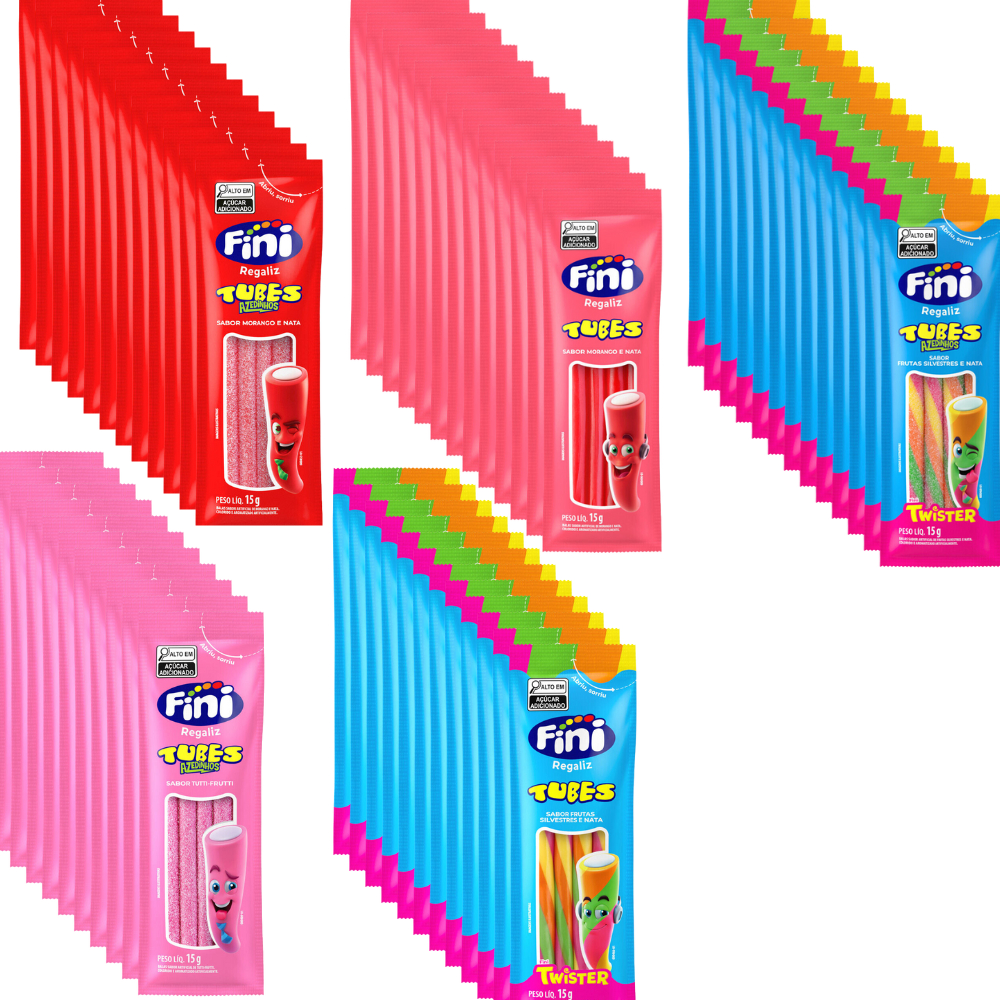 Um clássico da Fini!! Feito pra te acompanhar em todos os momentos, afinal quem não é apaixonado por tubes. O nosso kit vem com Tubes Morango com 12x15g cada, Tubes Morango Azedinho com 12x15g cada, Tubes Tutti Frutti Azedinho com 12x15g, Tubes Twister com 12x15g cada, Tubes Twister Azedinho com 12x15g cada.