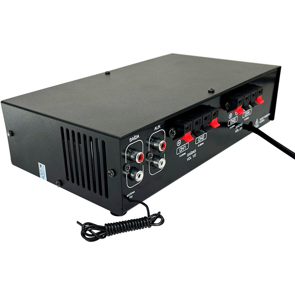 # Auto Equip # Seja bem-vindo(a)!!! --- Descrição: Kit Amplificador Som Ambiente Receiver Orion + 4 Arandela Orion Full Range - Leson Amplificador Som Ambiente Receiver Orion RC 7000 BT500W Ent. 2 Mic e Aux. 4 CH compacto para uso geral, desenvolvido pela Orion, com alto desempenho e qualidade de reprodução para todas as faixas de frequência de áudio. Possui Controle de Equalização, controles de volume, entrada auxiliar e entrada para 2 microfones. Ideal para completar qualquer projeto de som, seja em igrejas, escolas, hotéis, supermercados, bares, lojas, consultórios, etc. Você pode ouvir suas músicas com muito mais qualidade. Esse amplificador tem 500 Watts de potencia máxima PMPO e conta com tensão bivolt para você instalar com facilidade e garantir a execução do som com mais qualidade. Ele conta com conexão USB, SD, RCA, FN e Bluetooth, além de 2 entradas para microfone ou instrumentos musicais. Acompanha Controle remoto para trazer a comodidade de controlar seu som a distancia. Possui 4 saídas que suportam até 16 auto falantes(consultar manual de instalação para realizar a ligação correta) Compatível com App: BTLink Aplicativo usado para equalizar e controlar suas músicas pelo smartphone Receiver Mp3 Bluetooth Rc7000BT 500 Watts Saída Borne Especificações: - Potência: 125W Rms - Potência máxima PMPO: 500 W - Impedância Mínima: 4 Ohms - Duas Entradas P10 para microfones - Controle de Ganho individual dos Canais - 4 Canais de Saída de áudio Borne - Controle tom e Volume Mestre - Entrada Para Cartão SD ,MMC ,USB - Receptor Bluetooth - 1 Entrada RCA Medidas:Largura : 23,5 Cm - Profundidade : 16,5 Cm - Altura : 6,5 Cm * IMPORTANTE: Não ligar com a impedância menor que 4 Ohms, irá danificar o aparelho. Recomendamos que a instalação seja feita por um profissional* 4 Arandela Orion Full Range 6p 55w 8r Redonda Branca Par Especificações: - Full Range - Diâmetro Nominal: 19,4 cm - Dimensões internas: 18,2 cm - Dimensões (CxLxA): 19,5 x 6 x 19,5 cm - Faixa de Frequência: 48 HZa 10.000Hz - Impedância Nominal: 8 ohms - Potência RMS: 55 Wrms - Sensibilidade: 84dB - Carcaça em ABS - Bobina Simples - Peso: 545g Cada Conteúdo da Embalagem: - 01 - Receiver RC 5000 BT ORION - 01 - Controle - 04 - Caixas de som + suportes de fixação Importante - Garantia de 3 meses; - Pedidos aprovados até 12h00 de segunda a sexta será enviada no mesmo dia; - Enviamos em até 24h úteis; - A embalagem pode variar de acordo com o estoque do fabricante; - Imagens meramente ilustrativas; - A cor do produto pode variar de acordo com a tela do seu smartphone ou computador; - Utilize o campo de "Perguntas e respostas" e esclareça suas dúvidas com nosso suporte técnico. - Todas as informações divulgadas são de responsabilidade do Fabricante/Fornecedor