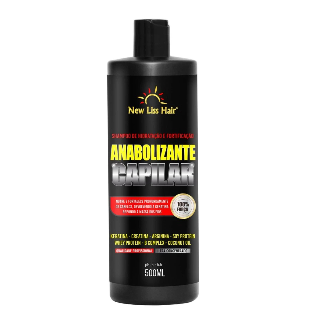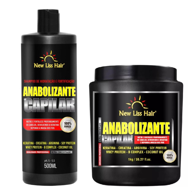 Anabolizante Capilar Ultra Concentrado 500g + shampoo 500ml New Liss Hair O creme de hidratação e fortificação Anabolizante Suplemento Capilar da New Liss Hair é um creme hidratante indicado para todos os tipos de cabelos, principalmente para quem está com os fios agredidos e danificados pela aplicação de química. Esse hidratante é ultra concentrado e promove 100% de força, hidratação e nutrição aos fios, recuperando instantaneamente os cabelos fragilizados. Promove a reposição da massa capilar perdida fazendo que o crescimento continuo dos fios permaneça sempre saudável e forte, evitando assim a quebra. Proporciona resultado profissional imediato, blindando as cutículas, dando maciez, brilho sedosidade e maleabilidade aos cabelos. O Anabolizante da New liss hair é um suplemento capilar que age sem deixar os fios pesados! O nome do produto faz referência aos anabolizantes, pois ambos possuem resultado rápido e eficaz, com a diferença que este produto para hidratação do cabelo é totalmente benéfico, natural e seguro. Pode confiar! Pode ser usado no salão ou em casa.
