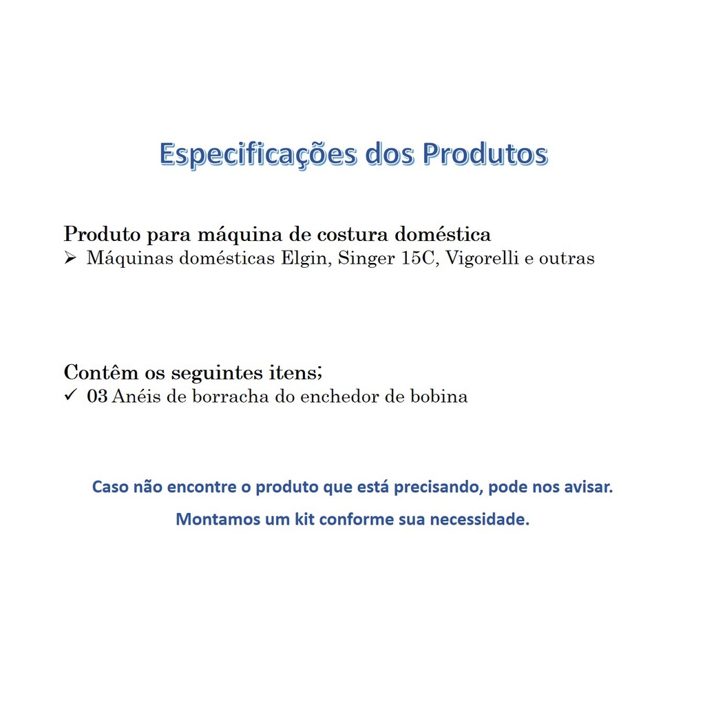 Produto para máquina de costura doméstica Máquinas domésticas Elgin, Singer 15C, Vigorelli e outras Contêm os seguintes itens; 03 Anéis de borracha do enchedor de bobina Caso não encontre o produto que está precisando, pode nos avisar. Montamos um kit conforme sua necessidade.