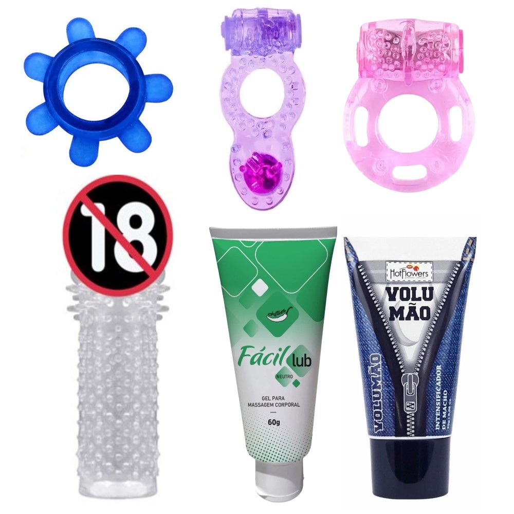 Este Kit Contém: 01 - Anel Peniano Prolongador Ereção Mega Strech 01 - Anel Peniano com Mini Vibrador Estimulador (Bateria grátis, inclusa) 01 - Super Anel Peniano Vibrador com Pérola Estimuladora (Bateria grátis, inclusa) 01 - Capa Peniana 01 - Lubrificante Neutro 01 - Volumão ATENÇÃO: Será enviado 01 anel de cada modelo em cor variada de acordo com a disponibilidade em estoque ANEL PENIANO Prolongador Ereção Mega Strech Anel Peniano de ótima resistência e flexibilidade, auxilia a Prolongar a ereção e retardar a ejaculação. O Anel peniano é super macio e muito flexível em silicone de alta qualidade ajusta facilmente a qualquer tamanho de pênis, instalado na base do pênis ou em um vibrador personal estimula a vulva e o clítoris e simultaneamente auxilia o homem a prolongar a ereção e a retardar a ejaculação. Não usar apertado no pênis por mais de 30 minutos seguidos. CAPA PENIANA A Capa Extensora Peniana é perfeita para elevar a autoestima dos homens e elevar também o prazer da mulher. Ele possui estimuladores que provocam sensações únicas na hora da penetração, levando a parceira ao orgasmo em menos tempo e com mais prazer. Experimente e melhore a experiência para ambos. Ficha Técnica Contém: 1 Capa peniana Tamanho: 13 cm (medidas aproximadas) Observação Adicional: A capa não acompanha caixa (embalagem), a mesma é enviada envolvida em um saquinho plástico. Como usar a Capa? Colocar no pênis ereto e colocar um lubrificante de sua preferência e começar a penetração. LUBRIFICANTE ÍNTIMO O Lubrificante Íntimo à base de água, é perfeito para quem deseja uma boa noite de sexo com o máximo de conforto e prazer! Desenvolvido de maneira estratégica, é livre de corantes e perfumes, tornando-se a escolha perfeita para aproveitar ao máximo as relações sexuais, massagens eróticas e qualquer outra experiência que necessite de lubrificação, como a masturbação com toys! Quais os Benefícios: Com o Lubrificante Íntimo você não precisa se preocupar com atritos e desconfortos durante a relação sexual, as suas propriedades avançadas atuam de maneira inteligente, garantindo uma excelente lubrificação duradoura, assim, você aproveita cada momento intenso! Outro ponto de destaque é sua textura leve e suave, que se assemelha perfeitamente à lubrificação natural do seu corpo, tornando cada momento uma incrível experiência natural e prazerosa! Como usar: Primeiramente, coloque uma boa quantidade do produto bem nas pontas dos dedos, logo após, massageie levemente sobre a região íntima desejada. Caso esteja se masturbando com toys, basta aplicar tanto na região íntima quanto no brinquedinho. VOLUMÃO gel Intesificador de Macho 25g Hot Flowers - SEX SHOP Produtos Eróticos Volumão é um lubrificante que intensifica a masculinidade e causa a sensação de inchaço no pênis. É recomendado para os homens que desejam ter um nível elevado de prazer, para os que têm dificuldade na ereção e reanima os que querem ter várias experiências na mesma noite. São extremamente afrodisíacas para o homem, aumenta a sensibilidade e proporciona uma imensa excitação. Modo de Uso: Um pouco antes da relação, aplicar uma quantidade diretamente no pênis estimulando-o gentilmente até todo o gel ser absorvido. Logo nos primeiros 5 minutos, os efeitos surgirão. * MODELO CONFORME DISPONIBILIDADE * EMBALAGEM DISCRETA