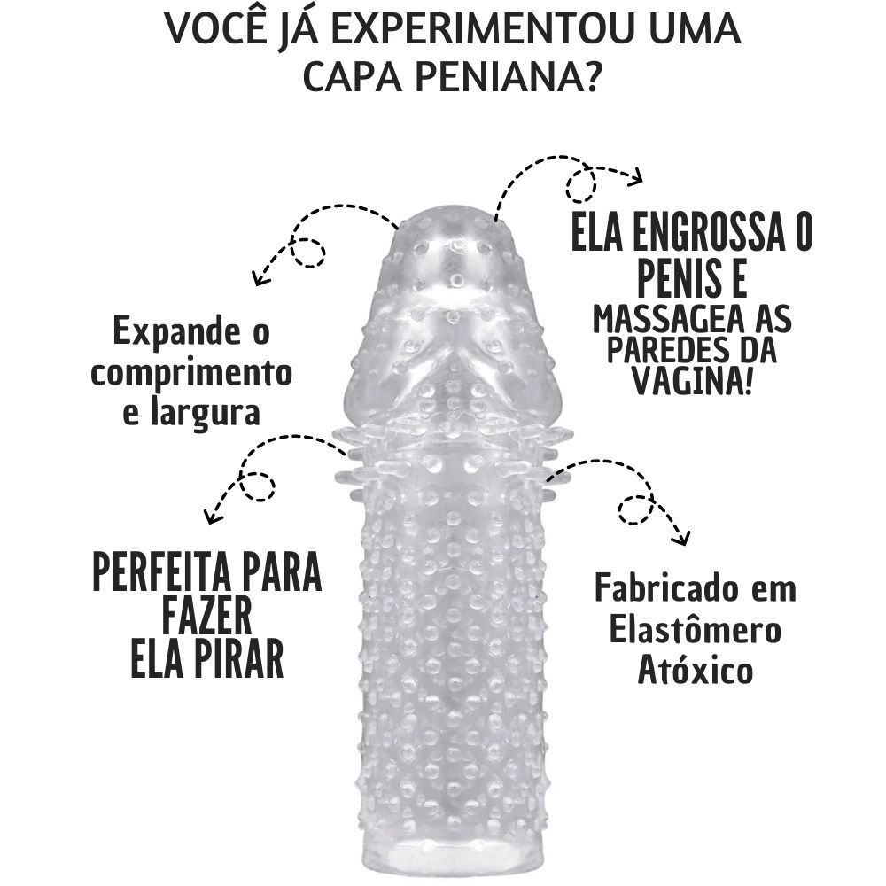 Kit Anel Peniano Vibrador + Capa de Silicone Peniana - SEX SHOP >>>CAPA PENIANA: A Capa Extensora Peniana é perfeita para elevar a autoestima dos homens e elevar também o prazer da mulher, podendo aumentar seu pênis em até 2,5 cm . Além de aumentá-lo, ele possui estimuladores que provocam sensações únicas na hora da penetração, levando a parceira ao orgasmo em menos tempo e com mais prazer. Experimente e melhore a experiência para ambos. Ficha Técnica: Contém: 1 Capa peniana Tamanho: 13 cm podendo aumentar seu pênis em até 2,5 cm (medidas aproximadas) Observação Adicional: A capa não acompanha caixa (embalagem), a mesma é enviada envolvida em um saquinho plástico. Como usar a Capa? Colocar no pênis ereto, aplicar um lubrificante de sua preferência e começar a penetração. Recomendações - Este material não substitui o preservativo. - Lavar antes e após o manuseio com água e sabão neutro. - Não compartilhe deste produto com outros parceiros. - Aconselhável o uso de lubrificantes. -------------------------------------------------------------------------------------------------------- >>>ANEL VIBRADOR: O Anel Peniano é um dos produtos mais procurados para aquele casal que deseja inovar e ter uma noite mais prolongada. O que é o anel peniano? Ele é um acessório que irá beneficiar o casal que buscam novas formas de aumentar o seu prazer, e dentre elas temos o anel peniano com vibro, onde ao usá-lo você sentirá as mais intensas ondas de prazer, tanto para ele quanto para ela. Este modelo ainda possui um mini vibrador, que durante a relação ele irá estimular o clitóris de sua parceira com muita habilidade, instigando suas zonas mais sensíveis e proporcionando orgasmos incríveis. Anel Peniano prolonga a ereção? Sim, pois a principal função do anel para o homem, é retardar a ejaculação, deixando a ereção mais firme e prolongada para que você tenha noites mais duráveis e muito mais prazerosas, pois tornará a penetração ainda mais diferenciada e gostosa para ambos.