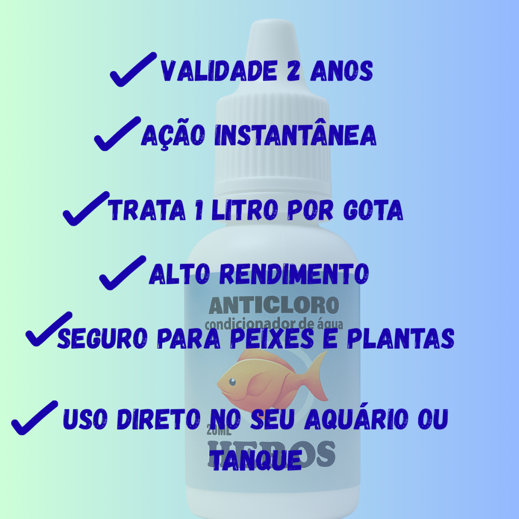 Kit 150 Unidades Anticloro 20ml – Condicionador de Água para Aquários 🟢 O melhor custo-benefício para lojistas, aquaristas e revendedores! Com este kit você leva 150 frascos de Anticloro 20ml. Cada unidade sai por apenas R$1,39, ideal para revenda ou para manter seu estoque sempre abastecido. ✅ Benefícios do Anticloro: Neutraliza o cloro da água da torneira Protege as brânquias e a pele dos peixes Torna a água segura para aquários de água doce Fácil aplicação e rápida ação 📦 O que você está comprando: 150 frascos de Anticloro 20ml cada Produto de uso seguro em aquários de peixes ornamentais 🐠 Modo de uso: Adicionar a dose recomendada de 1 gota por litro diretamente na água nova antes de introduzir no aquário. 💰 Por que escolher este kit? Melhor preço unitário: R$1,39 cada Produto prático, pronto para revenda ou uso contínuo Marca confiável no tratamento de água para aquários Validade 2 anos - Lote Atual Validade 06/2027