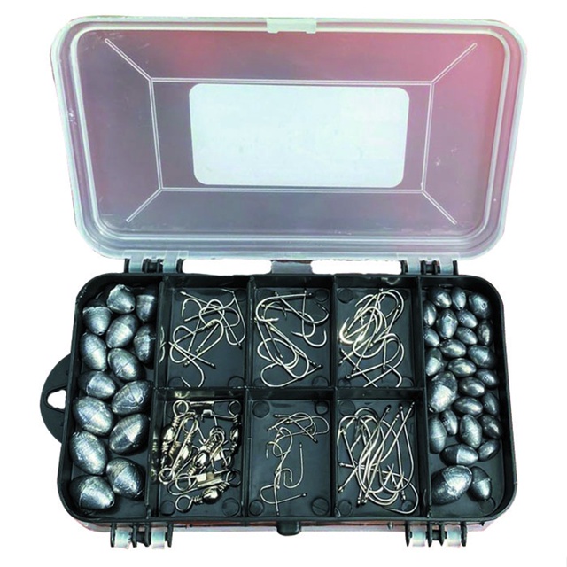 Tralha De Pesca Completa Com esse kit de acessórios você estará sempre preparado para diversos tipos de pescaria, a diversidade de acessórios possibilita a pesca de muitos tipos de peixes, além de 95 acessórios o kit acompanha um estojo organizador com divisórias muito resistente e com design arrojado, juntando o melhor da pesca em um único produto. Descrição: 1 Estojo Organizador 8002 Duplo com 13 Divisórias (16,5cm X 9,5cm X 4,5cm) Anzol 4330 Super Strong Marine Sports Niquelado Com Farpas: 10 Unidades - Anzol Nº1 (3,1cm X 1,3cm) 10 Unidades - Anzol Nº4 (2,6cm X 1,0cm) 10 Unidades - Anzol Nº6 (2,1cm X 0,9cm) 10 Unidades - Anzol Nº8 (1,8cm X 0,7cm) 10 Unidades - Anzol Nº10 (1,7cm X 0,6cm) Chumbo, Utilizado em Pesca no fundo: 8 Unidades – Chumbo Nº2 8 Unidades – Chumbo Nº4 8 Unidades – Chumbo Nº6 8 Unidades – Chumbo Nº11 8 Unidades – Chumbo Nº20 05 Unidades - Giradores com Snap em Aço Carbono Nº2, Super resistente, utilizado para evitar torção na linha.