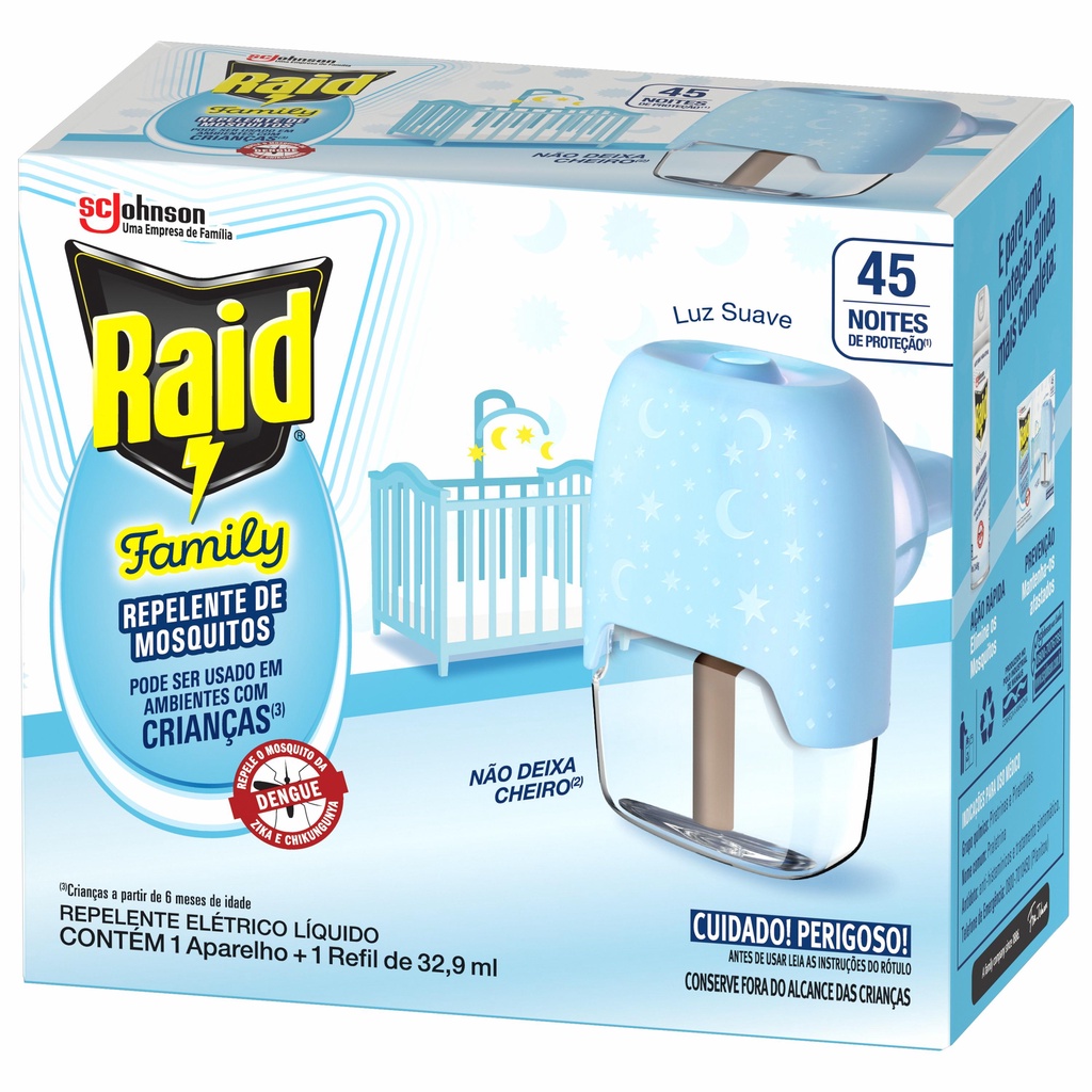 Raid Elétrico Líquido Family foi pensado especialmente para ambientes com crianças a partir de 6 meses. Oferece proteção contra os mosquitos, até mesmo os escondidos, para uma boa noite de sono para você e sua família, por até 45 noites. Utilize sempre um aparelho para cada 10m quadrados. Dica: coloque o aparelho na tomada 30 minutos antes de dormir e deixe sempre uma porta ou janela aberta para repelir os mosquitos do ambiente. 1. Abra a tampa do refil e o introduza no aparelho girando no sentido horário. 2. Plugue o aparelho na tomada bivolt (110-240V), sempre no sentido vertical. 3. Para desligar, retire o conjunto (aparelho + refil) da tomada e troque o refil quando estiver vazio.